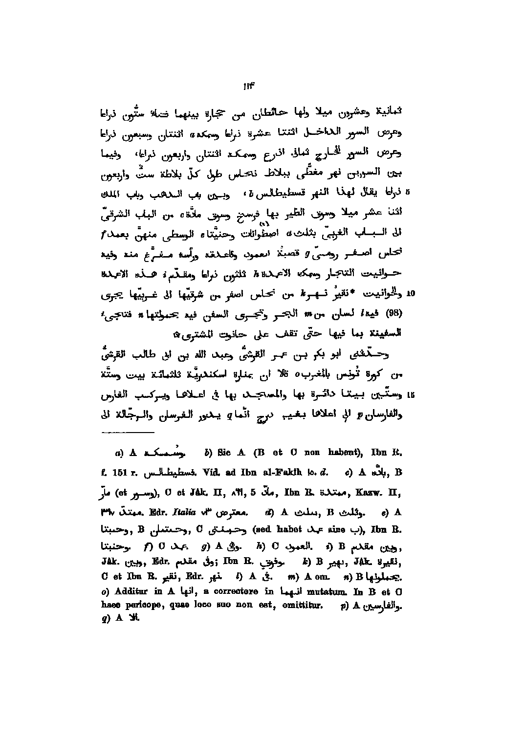 ثمانية وعشرون ميلا ولها حائطان من حجارة بينهما فضاء ستّون ذراعا وعرض السور الداخل اثنتا عشرة ذراعا وسمكه اثنتان وسبعون ذراعا وعرض السور الخارج ثمانى اذرع وسمكه اثنتان واربعون ذراعا، وفيما بين السورين نهر مغطّى ببلاط نحاس طول كلّ بلاطة ستّ واربعون ذراعا يقال لهذا النهر قسطيطالس، وبين باب الذهب وباب الملك اثنا عشر ميلا وسوق الطير بها فرسخ وسوق مادّة من الباب الشرقىّ الى الباب الغربىّ بثلث اصطوانات وحنيّتا الوسطى منهنّ بعمد نحاس اصفر رومىّ قصبة العمود وقاعدته ورأسه مفرّغ منه وفيه حوانيت التجار وسمك الاعمدة ثلثون ذراعا ومقدّم هذه الاعمدة والحوانيت نقير نهر من نحاس اصفر من شرقيّها الى غربيّها يجرى (98) فيه لسان من الجر وتجرى السفن فيه بحمولتها فتجىء السفينة بما فيها حتّى تقف على حانوت المشترى وحدّثنى ابو بكر بن عمر القرشىّ وعبد الله بن ابى طالب القرشىّ من كورة تونس بالمغرب قالا ان بمنارة اسكندريّة ثلثمائة بيت وستّة وستّين بيتا دائرة بها والمسجد بها فى اعلاها ويركب الفارس والفارسان الى اعلاها بغير درج انّما يدور الفرسان والرجّالة الى