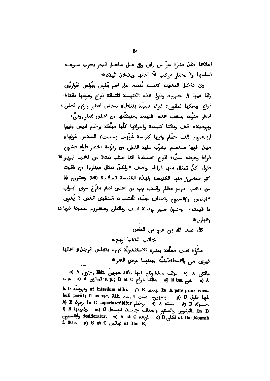 اعلاها مثل منارة سرّ من راى وهى على ساحل الجر يضرب موجه اساسها ولا يجتاز مركب الّا تحتها ويدخل البلاد وفى داخل المدينة كن؟ سة؟ ن؟ ت على اسم بطرس وبولس الحواريّين وهما فيها فى جرن وطول هذه الكنيسة ثلثمائة ذراع وعرضها مائتا ذراع وسمكها ثمانون ذراعا مبنيّة بقناطر نحاس اصفر واركان نحاس اصفر مفرّغة وسقف هذه الكنيسة وحيطانها من نحاس اصفر رومىّ، وبرومية الف ومائتا كنيسة واسواقها كلّها مبلّطة برخام ابيض وفيها اربعون الف حمّام وفيها كنيسة شبّهت ببيت المقدس طولها ميل فيها مذبح يقرّب عليه القربان من زمرّد اخضر طوله عشرون ذراعا وعرضه ستّ اذرع يحمله اثنا عشر تمثالا من ذهب ابريز طول كلّ تمثال منها ذراعان ونصف ولكلّ تمثال عينان من ياقوت احمر تضىء منها الكنيسة ولهذه الكنيسة ثمانية (99) وعشرون بابا من ذهب ابريز عظام والف باب من نحاس اصفر مفرّغ سوى ابواب ابنوس وابقسيون واصناف جيّد الخشب المنقوش الذي لا يدرى ما قيمته، وحول سور روم؟ ة الف ومائتان وعشرون عمودا فيها رهبان قال عبد الله بن عمرو بن العاص