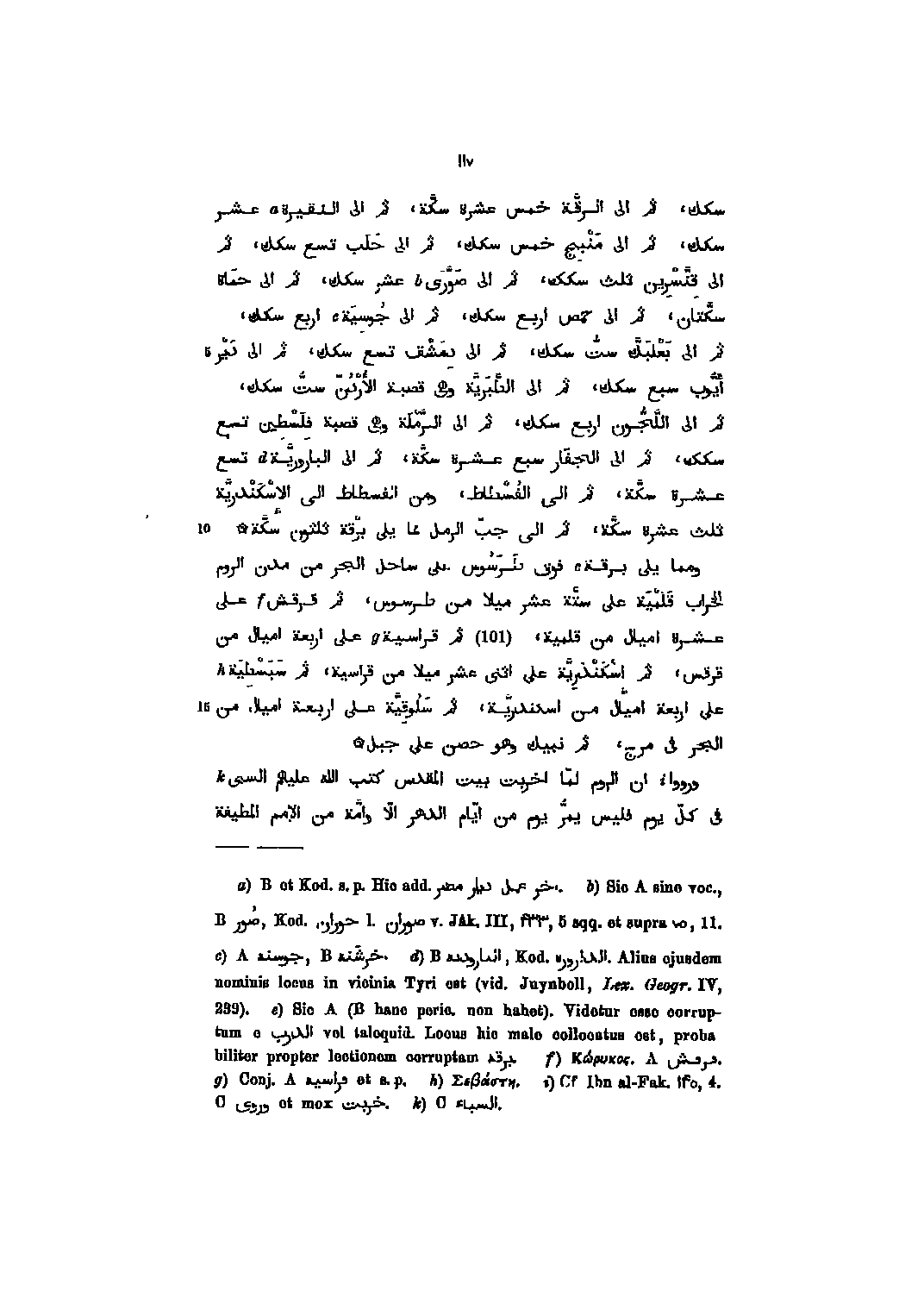 سكك، ثم الى الرقّة خمس عشرة سكّة، ثم الى النقيرة عشر سكك، ثم الى منبج خمس سكك، ثم الى حلب تسع سكك، ثم الى قنّسرين ثلث سكك، ثم الى صوّرى عشر سكك، ثم الى حماة سكّتان، ثم الى حمص اربع سكك، ثم الى جوسية اربع سكك، ثم الى بعلبكّ ستّ سكك، ثم الى دمشق تسع سكك، ثم الى دير أيّوب سبع سكك، ثم الى الطّبريّة وهى قصبة الأردنّ ستّ سكك، ثم الى اللّجّون اربع سكك، ثم الى الرّملة وهى قصبة فلسطين تسع سكك، ثم الى الجفار سبع عشرة سكّة، ثم الى الباروريّة تسع عشرة سكّة، ثم الى الفسطاط، ومن الفسطاط الى الاسكندريّة ثلث عشرة سكّة، ثم الى جبّ الرمل مما يلى برقة ثلثون سكّة ومما يلى برقة فوق طرسوس على ساحل البحر من مدن الروم الخراب قلمية على ستّة عشر ميلا من طرسوس، ثم قرقش على عشرة اميال من قلمية، (101) ثم قراسية على اربعة اميال من قرقس، ثم اسكندريّة على اثنى عشر ميلا من قراسية، ثم سبسطية على اربعة اميال من اسكندريّة، ثم سلوقيّة على اربعة اميال من الجر فى مرج، ثم نبيك وهو حصن على جبل ورووا ان الروم لمّا اخربت بيت المقدس كتب الله عليهم السبى فى كلّ يوم فليس يمرّ يوم من ايّام الدهر الّا وامّة من الامم المطيفة
