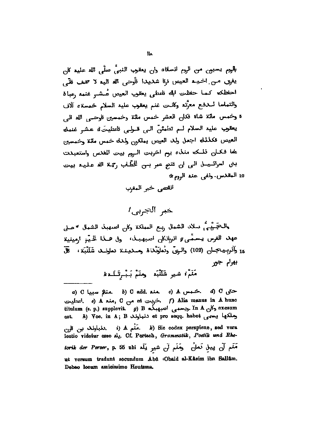 بالروم يسبون من الروم انسانا وان يعقوب النّبيّ صلّى الله عليه كان يفرق من اخيه العيص فرقا شديدا فأوحى الله اليه لا تخف فانّى احفظك كما حفظت اباك فاعطى يعقوب العيص عشر غنمه رعبا والتماسا لدفع معرّته وكانت غنم يعقوب عليه السلام خمسة آلاف وخمس مائة شاة فكان العشر خمس مائة وخمسين فاوحى الله الى يعقوب عليه السلام لم تطمئنّ الى قولى فاعطيت عشر غنمك العيص فكذلك اجعل ولد العيص يملكون ولدك خمس مائة وخمسين عاما فكان ذلك منذ يوم اخربت الروم بيت المقدس واستعبدت بنى اسرائيل الى ان فتح عمر بن الخطّاب رحمة الله عليه بيت المقدس. ونفى عنه الروم انقضى خبر المغرب