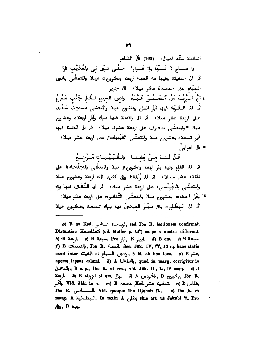 البادية ستّة اميال، (109) قال الشاعر يا صاح لا نوما ولا قرارا حتّى ترى لى بالعذيب نارا ثم الى المغيثة وفيها ماء السماء اربعة وعشرون ميلا والمتعشّى وادى السباع على خمسة عشر ميلا، قال جرير انّ الرّزيّة من تضمّن قبره وادى السّياع لكلّ جنب مصرع ثم الى القرعاء فيها آبار اثنان وثلثون ميلا والمتعشّى مسجد سعد على اربعة عشر ميلا، ثم الى واقصة فيها برك وآبار اربعة وعشرون ميلا والمتعشّى بالطرف على اربعة عشر ميلا، ثم الى العقبة فيها آبار تسعة وعشرون ميلا والمتعشّى القبيبات على اربعة عشر ميلا، قال اعرابىّ هل لنا من زماننا بالقبيبات مرجع ثم الى القاع وفيه بئر اربعة وعشرون ميلا والمتعشّى بالبحلحاء على ثلثة عشر ميلا، ثم الى زبالة وهى كثيرة الماء اربعة وعشرون ميلا والمتعشّى بالجريسىّ على اربعة عشر ميلا، ثم الى الشّقوق فيها برك وآبار احد وعشرون ميلا والمتعشّى التّنانير على اربعة عشر ميلا، ثم الى البطان وهى قبر العبادىّ فيه برك تسعة وعشرون ميلا