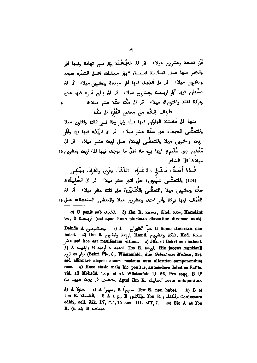 منها الى مغيثة الماوان فيها برك وآبار وماء نزر ثلثة وثلثون ميلا والمتعشّى السمط على ستّة عشر ميلا، ثم الى الرّبذة فيها برك وآبار اربعة وعشرون ميلا والمتعشّى اريمة على اربعة عشر ميلا، ثم الى معدن بنى سليم فيها برك ماء اقلّ ما يوجد فيها الماء اربعة وعشرون ميلا قال الشاعر هذا أحقّ منزل بالتّرك الذّئب يعوى والغراب يبكى (114) والمتعشّى شرورى على اثنى عشر ميلا، ثم الى السّليلة ستّة وعشرون ميلا والمتعشّى بالكنابين على ثلثة عشر ميلا، ثم الى العمق فيها بركة وآبار احد وعشرون ميلا والمتعشّى السنجة على