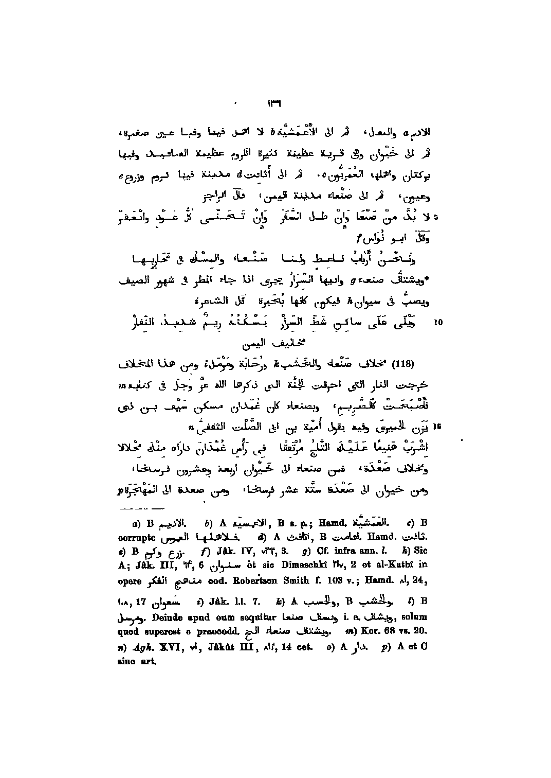 الادم والنعل، ثم الى الأعمشيّة لا اهل فيها وفيها عين صغيرة، ثم الى خيوان وهى قرية عظيمة كثيرة الكروم عظيمة العناقيد وفيها بركتان واهلها العمريّون، ثم الى أثافت مدينة فيها كروم وزروع وعيون، ثم الى صنعاء مدينة اليمن، قال الراجز لا بدّ من صنعا وإن طل السّفر وإن تحنّى كلّ عود وانعقر وقال ابو نواس ونحن أرباب ناعط ولنا صنعاء والمسك فى محاربها ويشتقّ صنعاء واديها السّرار يجرى اذا جاء المطر فى شهور الصيف ويصبّ فى سيوان فيكون كانها بحيرة قال الشاعر ويلى على ساكن شطّ السّرار يسكنه ريم شديد النّفار