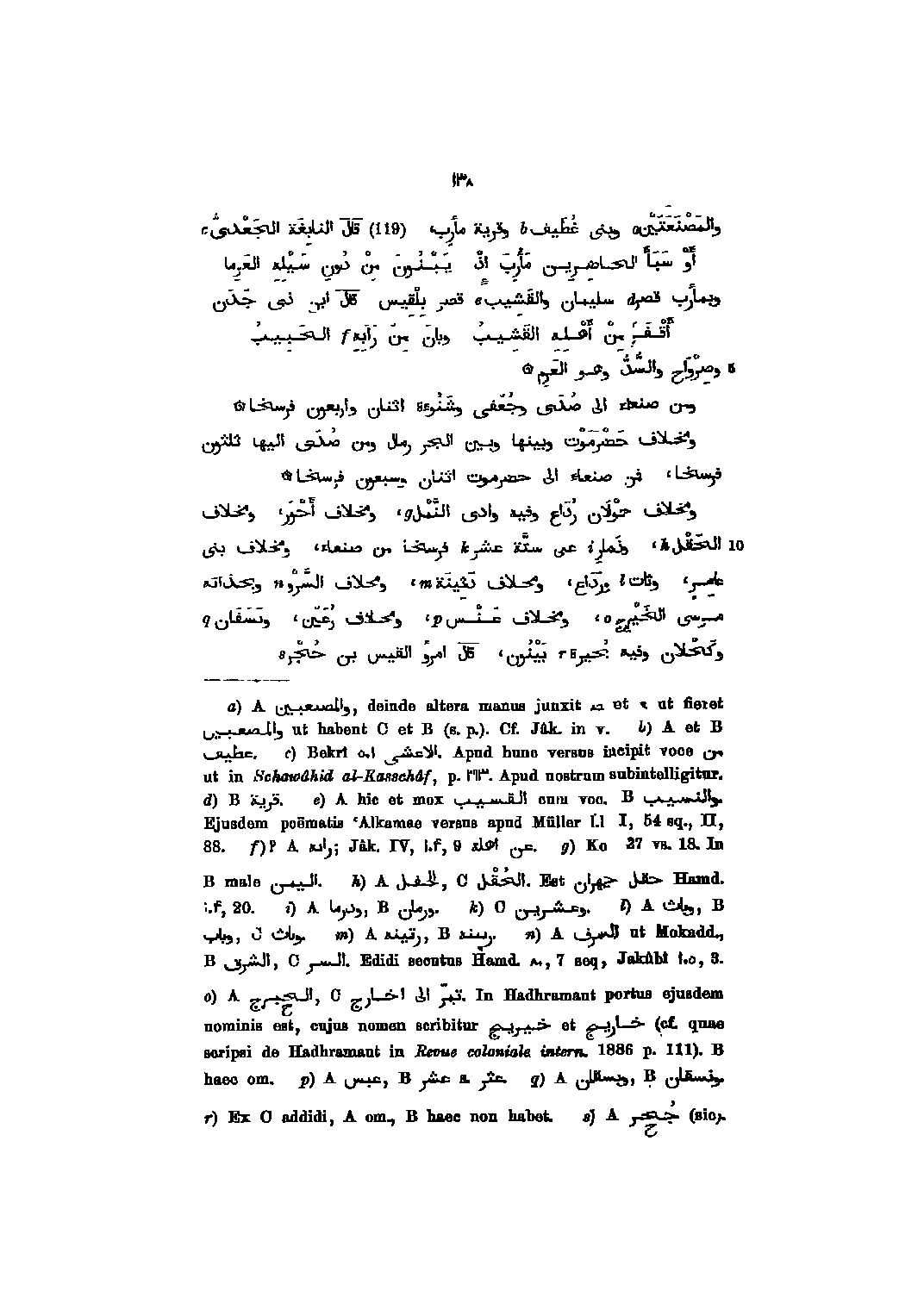 والمصنعتين وبنى غطيف وقرية مأرب، (119) قال النابغة الجعدىّ أو سبأ الحاضرين مأرب اذ يبنون من دون سيله العرما وبمأرب قصر سليمان والقشيب قصر بلقيس قال ابن ذى جدن أقفر من أهله القشيب وبان من رابه الحبيب وصرواح والسّدّ وهو العرم ومن صنعاء الى صدى وجعفى وشنوءة اثنان واربعون فرسخا ومخلاف حضرموت وبينها وبين الجر رمال ومن صدى اليها ثلثون فرسخا، فمن صنعاء الى حضرموت اثنان وسبعون فرسخا ومخلاف حولان رداع وفيه وادى النّمل، ومخلاف أحور، ومخلاف الحقل، وذمار ع؟ ى ستّة عشر فرسخا من صنعاء، ومخلاف بنى عامر، وثات ورداع، ومخلاف دثينة، ومخلاف السّرو وبحداته مرسى الخير، ومخلاف عنس، ومخلاف رعين، ونسفان وكحلان وفيه بحيرة بينون، قال امرؤ القيس بن حجر