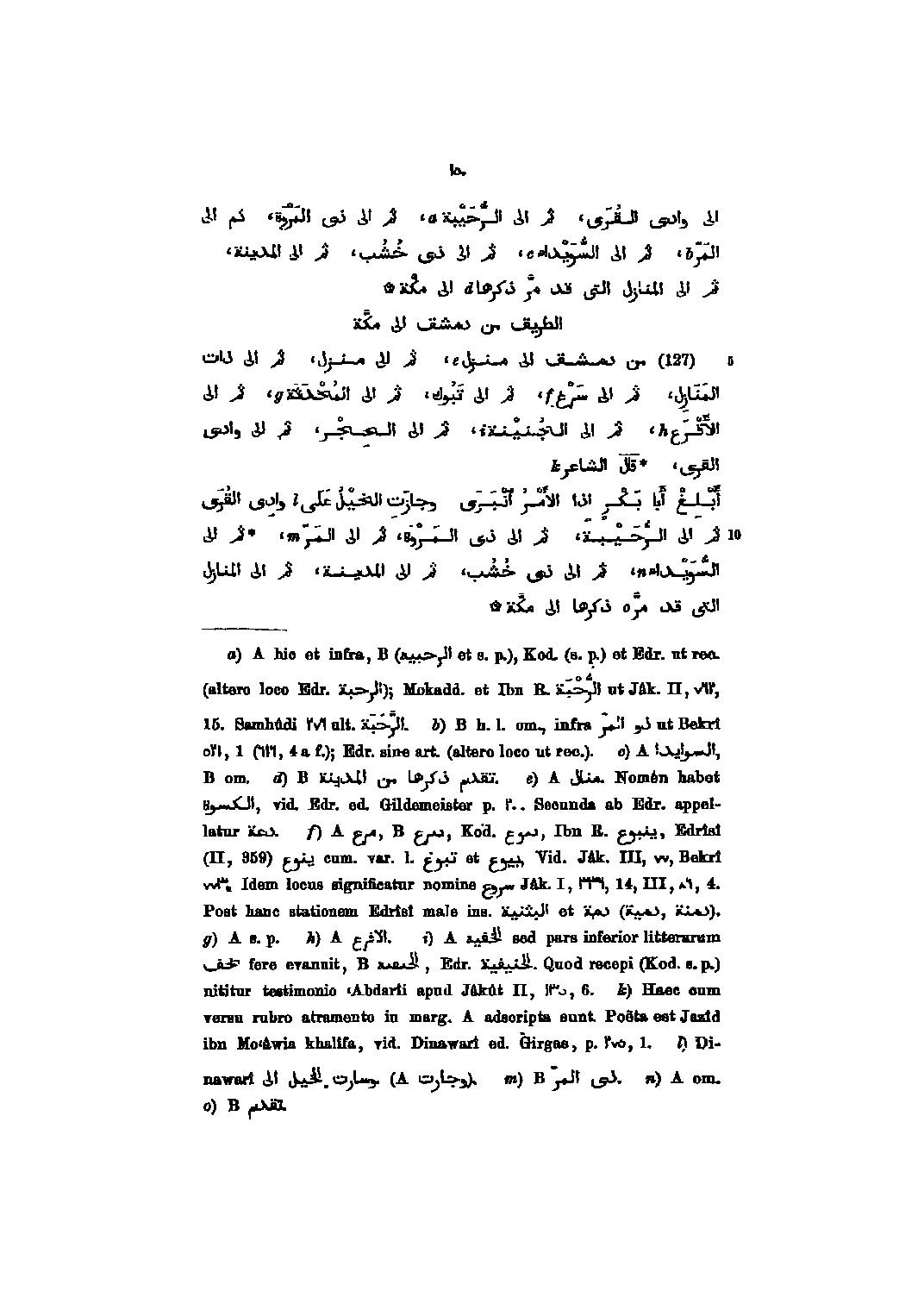 (127) من دمشق الى منزل، ثم الى منزل، ثم الى ذات المنازل، ثم الى سرغ، ثم الى تبوك، ثم الى المحدثة، ثم الى الأقرع، ثم الى الجنينة، ثم الى الحجر، ثم الى وادى القرى، قال الشاعر أبلغ أبا بكر اذا الأمر انبرى وجازت الخيل على وادى القرى ثم الى الرّحيبة، ثم الى ذى المروة، ثم الى المرّ، ثم الى السّويداء، ثم الى ذى خشب، ثم الى المدينة، ثم الى المنازل التى قد مرّ ذكرها الى مكّة