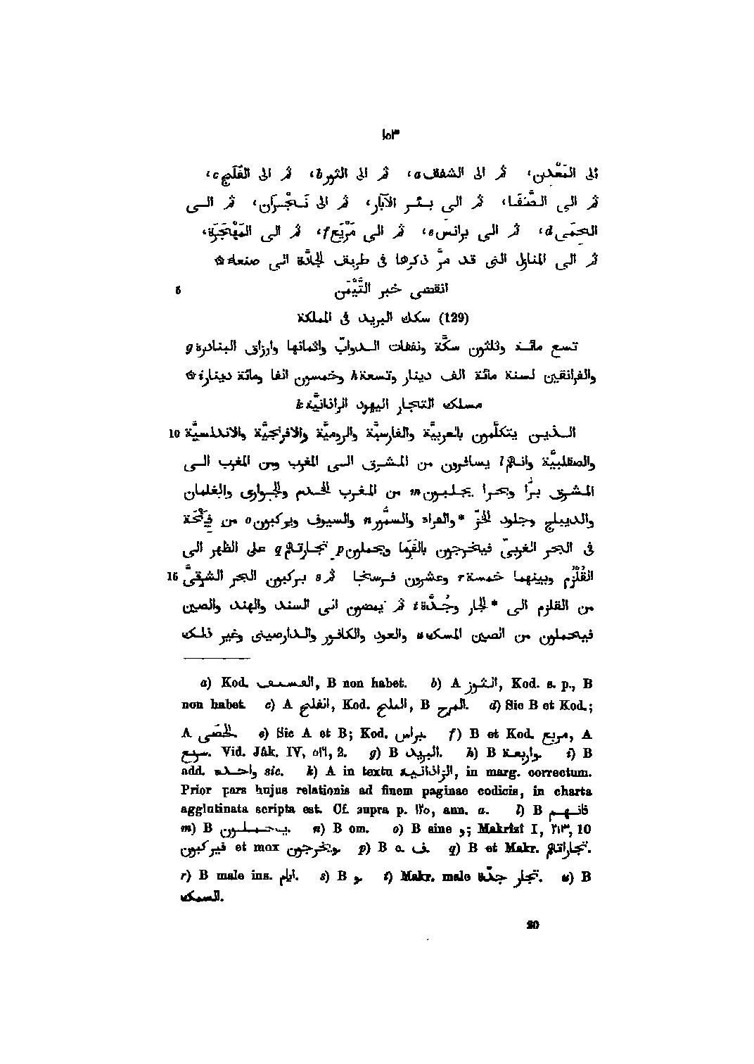 الذين يتكلّمون بالعربيّة والفارسيّة والروميّة والافرنجيّة والاندلسيّة والصقلبيّة وانهم يسافرون من المشرق الى المغرب ومن المغرب الى المشرق برّا وبحرا يجلبون من المغرب الخدم والجوارى والغلمان والديباج وجلود الخزّ* والفراء والسمّور والسيوف ويركبون من فنحة فى الجر الغربىّ فيخرجون بالفرما ويحملون تجارتهم على الظهر الى القلزم وبينهما خمسة وعشرون فرسخا ثم يركبون الجر الشرقىّ من القلزم الى* الجار وجدّة ثم يمضون الى السند والهند والصين فيحملون من الصين المسك والعود والكافور والدارصينى وغير ذلك