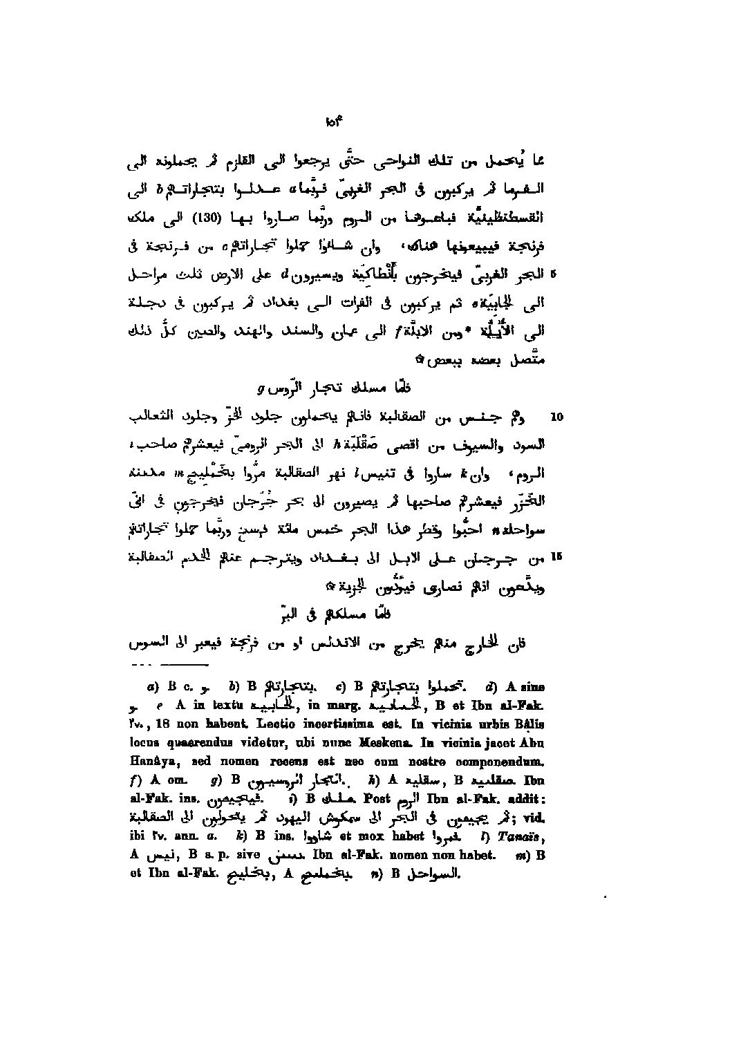 مما يحمل من تلك النواحى حتّى يرجعوا الى القلزم ثم يحملونه الى الفرما ثم يركبون فى الجر الغربىّ فربّما عدلوا بتجاراتهم الى القسطنطينيّة فباعوها من الروم وربّما صاروا بها (130) الى ملك فرنجة فيبيعونها هناك، وان شاءوا حملوا تجاراتهم من فرنجة فى الجر الغربىّ فيخرجون بأنطاكية ويسيرون على الارض ثلث مراحل الى الجابية ثم يركبون فى الفرات الى بغداد ثم يركبون فى دجلة الى الأيلّة ومن الابلّة الى عمان والسند والهند والصين كلّ ذلك متّصل بعضه ببعض