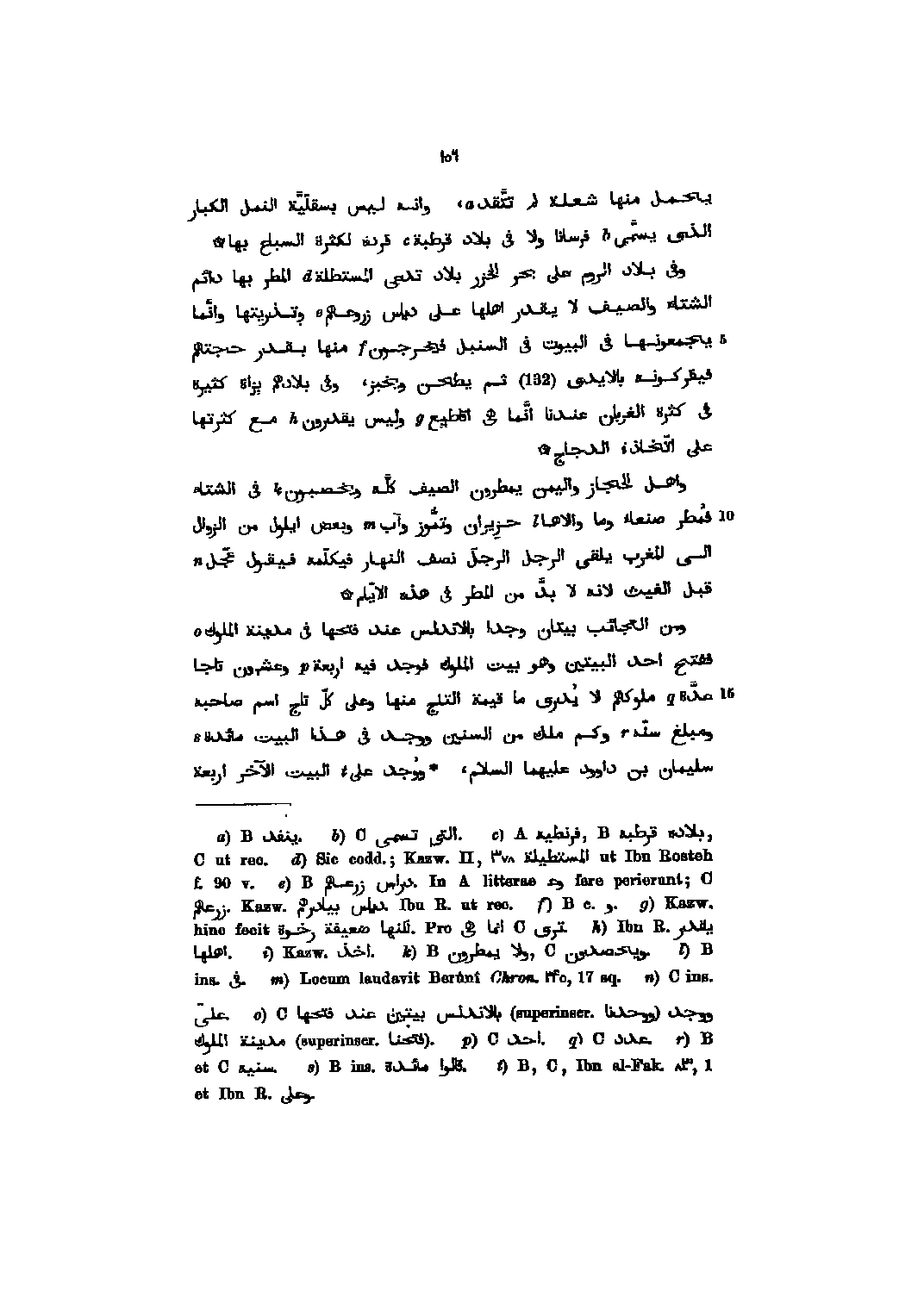 يحمل منها شعلة لم تتّقد، وانه ليس بسقلّيّة النمل الكبار الذي يسمّى فرسانا ولا فى بلاد قرطبة قردة لكثرة السباع بها وفى بلاد الروم على بحر الخزر بلاد تدعى المستطلة المطر بها دائم الشتاء والصيف لا يقدر اهلها على دياس زروعهم وتذريتها وانّما يجمعونها فى البيوت فى السنبل فيخرجون منها بقدر حاجتهم فيقركونه بالايدى (132) ثم يطحن ويخبز، وفى بلادهم بزاة كثيرة فى كثرة الغربان عندنا انّما هى اقاطيع وليس يقدرون مع كثرتها على اتّخاذ الدجاج واهل الحجاز واليمن يمطرون الصيف كلّه ويخصبون فى الشتاء فمطر صنعاء وما والاها حزيران وتموز وآب وبعض ايلول من الزوال الى المغرب يلقى الرجل الرجل نصف النهار فيكلّمه فيقول عجّل قبل الغيث لانه لا بدّ من المطر فى هذه الايّام ومن العجائب بيتان وجدا بالاندلس عند فتحها فى مدينة الملوك ففتح احد البيتين وهو بيت الملوك فوجد فيه اربعة وعشرون تاجا عدّة ملوكهم لا يدرى ما قيمة التاج منها وعلى كلّ تاج اسم صاحبه ومبلغ سنّه وكم ملك من السنين ووجد فى هذا البيت مائدة سليمان بن داوود عليهما السلام، ووجد على البيت الآخر اربعة