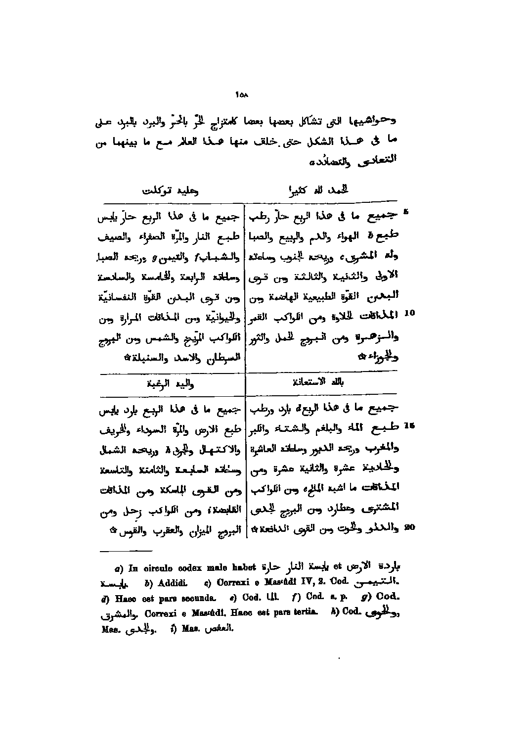 وحواشيها التى تشاكل بعضها بعضا كامتزاج الحرّ بالحرّ والبرد بالبرد على ما فى هذا الشكل حتى خلق منها هذا العالم مع ما بينهما من التعادى والتضاد الحمد لله كثيرا جميع ما فى هذا الربع حارّ رطب طبع الهواء والدم والربيع والصبا وله المشرق وريحه الجنوب وساءته الاولى والثانية والثالثة ومن قوى البدن القوّة الطبيعية الهاضمة ومن المذاقات الحلاوة ومن الكواكب القمر والزهرة ومن البروج الحمل والثور والجوزاء وعليه توكلت جميع ما فى هذا الربع حارّ يابس طبع النار والمرّة الصفراء والصيف والشباب والتيمن وريحه الصبا وساءاته الرابعة والخامسة والسادسة ومن قوى البدن القوّة النفسانيّة والحيوانيّة ومن المذاقات المرارة ومن الكواكب المرّيخ والشمس ومن البروج السرطان والاسد والسنبلة بالله الاستعانة جميع ما فى هذا الربع بارد ورطب طبع الماء والبلغم والشتاء والكبر والمغرب وريحه الدبور وساعاته العاشرة والحادية عشرة والثانية عشرة ومن المذاقات ما اشبه المالح ومن الكواكب المشترى وعطارد ومن البروج الجدى والدلو والحوت ومن القوى الدافعة واليه الرغبة جميع ما فى هذا الربع بارد يابس طبع الارض والمرّة السوداء والخريف والاكتهال والجربى وريحه الشمال وساعاته السابعة والثامنة والتاسعة ومن القوى الماسكة ومن المذاقات القابضة ومن الكواكب زحل ومن البروج الميزان والعقرب والقوس