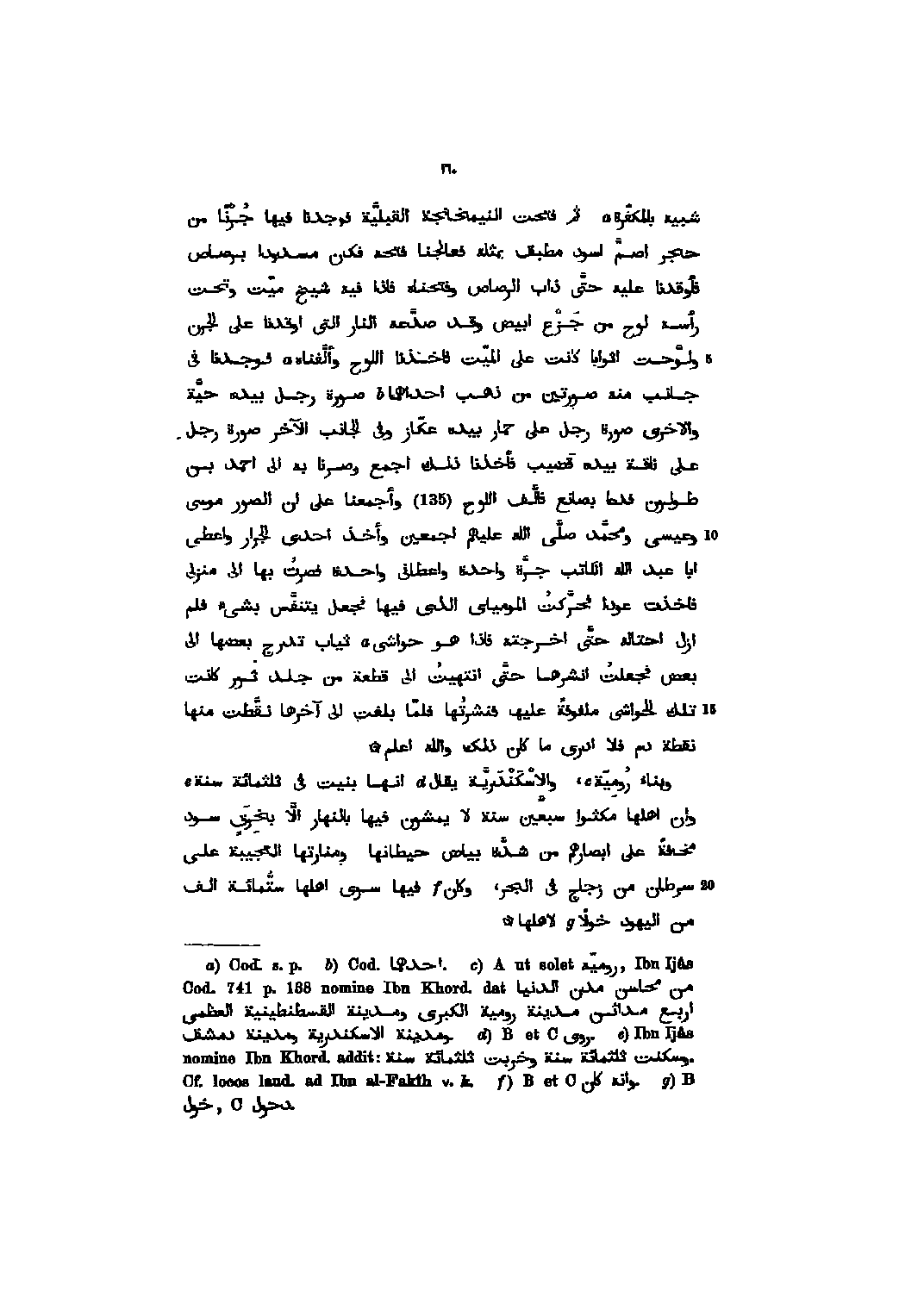 شبيه بالمكفّرة ثم فتحت النيمخانجة القبليّة فوجدنا فيها جرنا من حجر اصمّ اسود مطبق بمثله فعالجنا فتحه فكان مسدودا برصاص فأوقدنا عليه حتّى ذاب الرصاص وفتحناه فاذا فيه شيخ ميّت وتحت رأسه لوح من جزع ابيض وقد صدّعه النار التى اوقدنا على الجرن ولوّحت اثوابا كانت على الميّت فاخذنا اللوح وألّفناه فوجدنا فى جانب منه صورتين من ذهب احداهما صورة رجل بيده حيّة والاخرى صورة رجل على حمار بيده عكّاز وفى الجانب الآخر صورة رجل على ناقة بيده قضيب فأخذنا ذلك اجمع وصرنا به الى احمد بن طولون فدعا بصانع فالّف اللوح (135) وأجمعنا على ان الصور موسى وعيسى ومحمّد صلّى الله عليهم اجمعين وأخذ احدى الجرار واعطى ابا عبد الله الكاتب جرّة واحدة واعطانى واحدة فصرت بها الى منزلى فاخذت عودا فحرّكت المومياى الذي فيها فجعل يتنفّس بشىء فلم ازل احتاله حتّى اخرجته فاذا هو حواشى ثياب تدرج بعضها الى بعض فجعلت انشرها حتّى انتهيت الى قطعة من جلد ثور كانت تلك الحواشى ملفوفة عليها فنشرتها فلمّا بلغت الى آخرها نقّطت منها نقطة دم فلا ادرى ما كان ذلك والله اعلم وبناء رومية، والاسكندريّة يقال انها بنيت فى ثلثمائة سنة وان اهلها مكثوا سبعين سنة لا يمشون فيها بالنهار الّا بخرق سود مخافة على ابصارهم من شدّة بياض حيطانها ومنارتها العجيبة على سرطان من زجاج فى الجر، وكان فيها سوى اهلها ستّمائة الف من اليهود خولا لاهلها