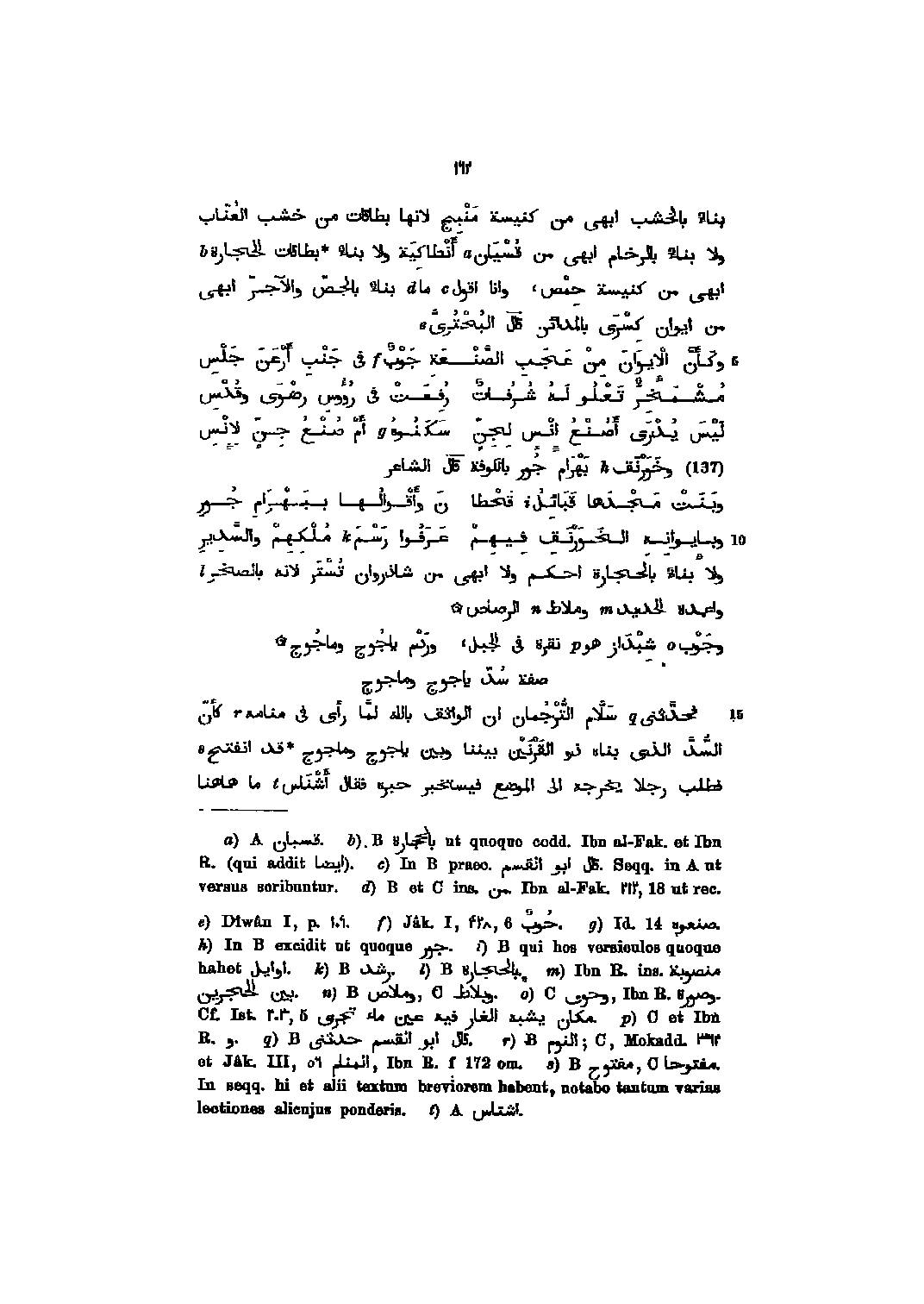 بناء بالخشب ابهى من كنيسة منبج لانها بطاقات من خشب العنّاب ولا بناء بالرخام ابهى من قسيان أنطاكية ولا بناء بطاقات الحجارة ابهى من كنيسة حمص، وانا اقول ما بناء بالجصّ والآجرّ ابهى من ايوان كسرى بالمدائن قال البحترىّ وكأنّ الايوان من عجب الصّنعة جوب فى جنب أرعن جلس مشمخرّ تعلو له شرفات رفعت فى رؤوس رضوى وقدس ليس يدرى أصنع انس لجنّ سكنوه أم صنع جنّ لانس (137) وخورنق بهرام جور بالكوفة قال الشاعر وبنت مجدها قبائل قحطا* ن وأقوالها ببهرام جور وبايوانه الخورنق فيهم* عرفوا رسم ملكهم والسّدير ولا بناء بالحجارة احكم ولا ابهى من شاذروان تستر لانه بالصخر واعمدة الحديد وملاط الرصاص وجوب شبداز نقرة فى الجبل، وردم ياجوج وماجوج