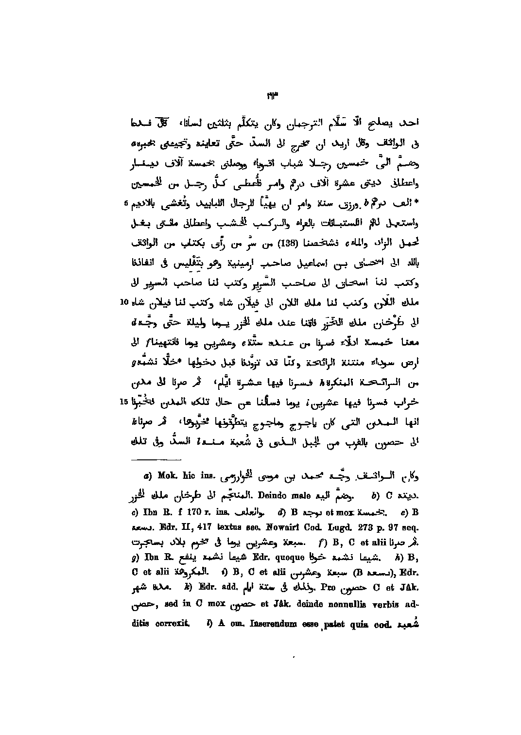 احد يصلح الّا سلّام الترجمان وكان يتكلّم بثلثين لسانا، قال فدعا بى الواثق وقال اريد ان تخرج الى السدّ حتّى تعاينه وتجيئنى بخبره وضمّ الىّ خمسين رجلا شباب اقوياء ووصلنى بخمسة آلاف دينار واعطانى ديتى عشرة آلاف درهم وامر فأعطى كلّ رجل من الخمسين الف درهم ورزق سنة وامر ان يهيّأ للرجال اللبابيد وتغشى بالاديم واستعمل لهم الكستبانات بالفراء والركب الخشب واعطانى مائتى بغل لحمل الزاد والماء فشخصنا (138) من سرّ من رأى بكتاب من الواثق بالله الى اسحاق بن اسماعيل صاحب ارمينية وهو بتفليس فى انفاذنا وكتب لنا اسحاق الى صاحب السّرير وكتب لنا صاحب السرير الى ملك اللّان وكتب لنا ملك اللان الى فيلان شاه وكتب لنا فيلان شاه الى طرخان ملك الخزر فاقنا عند ملك الخزر يوما وليلة حتّى وجّه معنا خمسة ادلّاء فسرنا من عنده ستّة وعشرين يوما فانتهينا الى ارض سوداء منتنة الرائحة وكنّا قد تزوّدنا قبل دخولها خلّا نشمّه من الرائحة المنكرة فسرنا فيها عشرة ايّام، ثم صرنا الى مدن خراب فسرنا فيها عشرين يوما فسألنا عن حال تلك المدن فخبّرنا انها المدن التى كان ياجوج وماجوج يتطرّقونها فخرّبوها، ثم صرنا الى حصون بالقرب من الجبل الذي فى شعبة منه السدّ وفى تلك