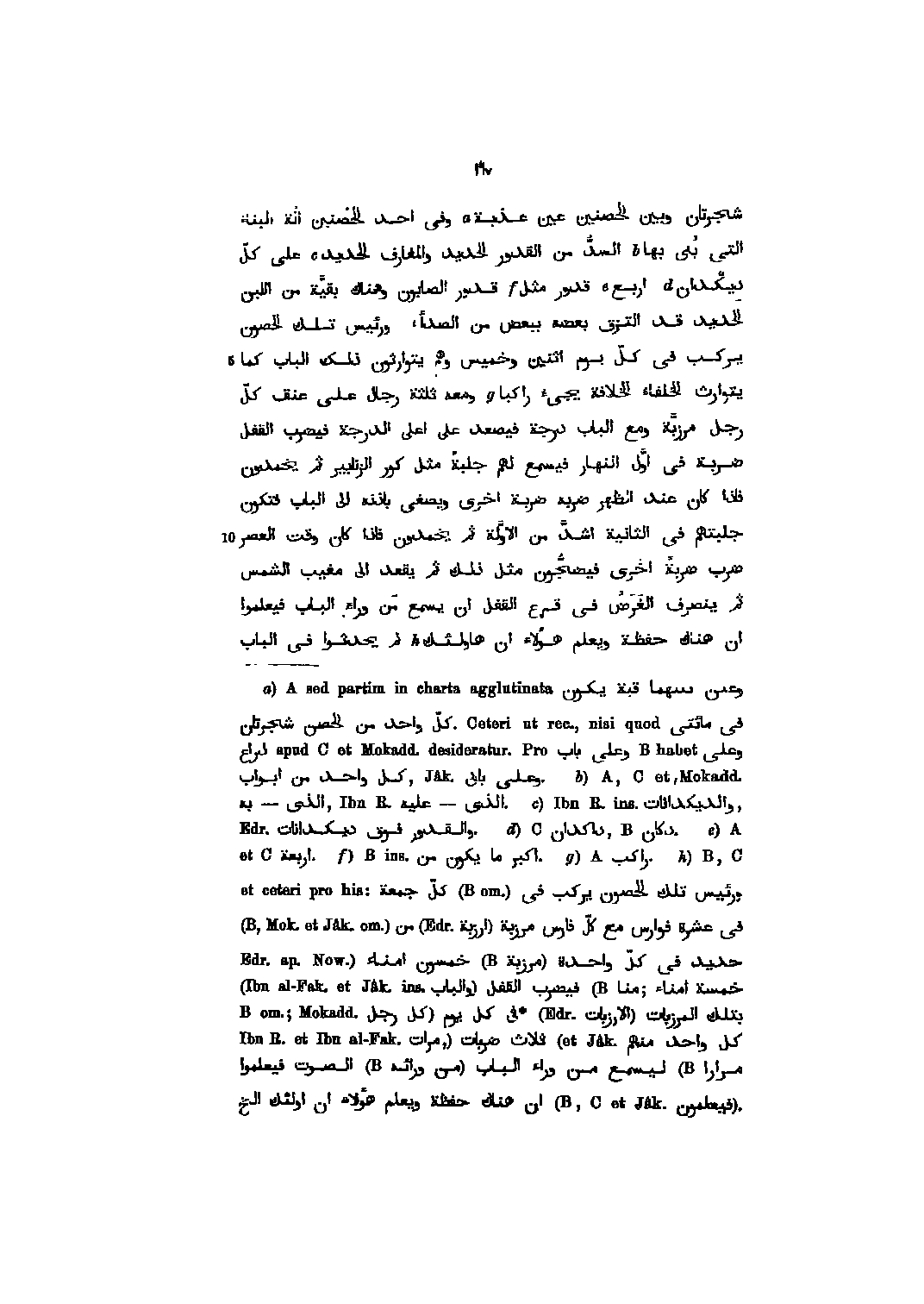 شجرتان وبين الحصنين عين عذبة وفى احد الحصنين آلة البناء التى بنى بها السدّ من القدور الحديد والمغارف الحديد على كلّ ديكدان اربع قدور مثل قدور الصابون وهناك بقيّة من اللبن الحديد قد التزق بعضه ببعض من الصدأ، ورئيس تلك الحصون يركب فى كلّ يوم اثنين وخميس وهم يتوارثون ذلك الباب كما يتوارث الخلفاء الخلافة يجيء راكبا ومعه ثلثة رجال على عنق كلّ رجل مرزبّة ومع الباب درجة فيصعد على اعلى الدرجة فيضرب القفل ضربة فى اوّل النهار فيسمع لهم جلبة مثل كور الزنابير ثم يخمدون فاذا كان عند الظهر ضربه ضربة اخرى ويصغى باذنه الى الباب فتكون جلبتهم فى الثانية اشدّ من الاوّلة ثم يخمدون فاذا كان وقت العصر ضرب ضربة اخرى فيضجّون مثل ذلك ثم يقعد الى مغيب الشمس ثم ينصرف الغرض فى قرع القفل ان يسمع من وراء الباب فيعلموا ان هناك حفظة ويعلم هؤلاء ان هاولئك لم يحدثوا فى الباب
