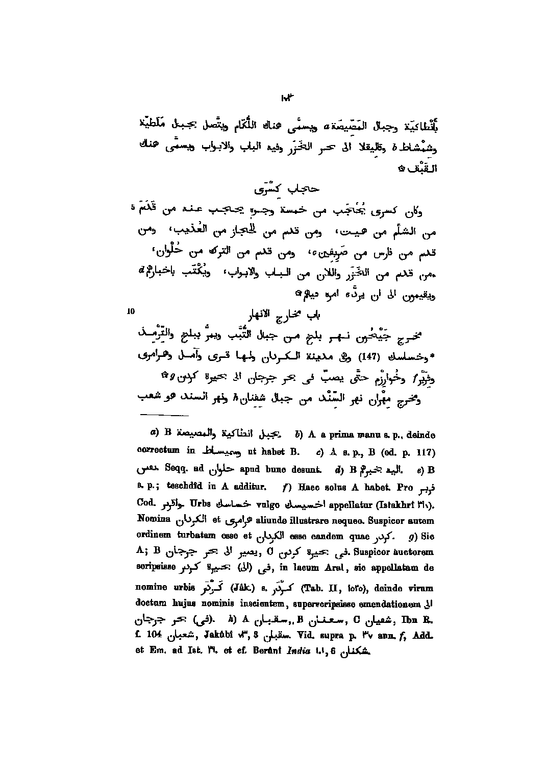 مخرج جيحون نهر بلخ من جبال التّبّب ويمرّ ببلخ والتّرمذ وخساسك (147) وهى مدينة الكردان ولها قرى وآمل وهرامرى وفربر وخوارزم حتّى يصبّ فى بحر جرجان الى بحيرة كردن ومخرج مهران نهر السّند من جبال شقنان ونهر السند هو شعب