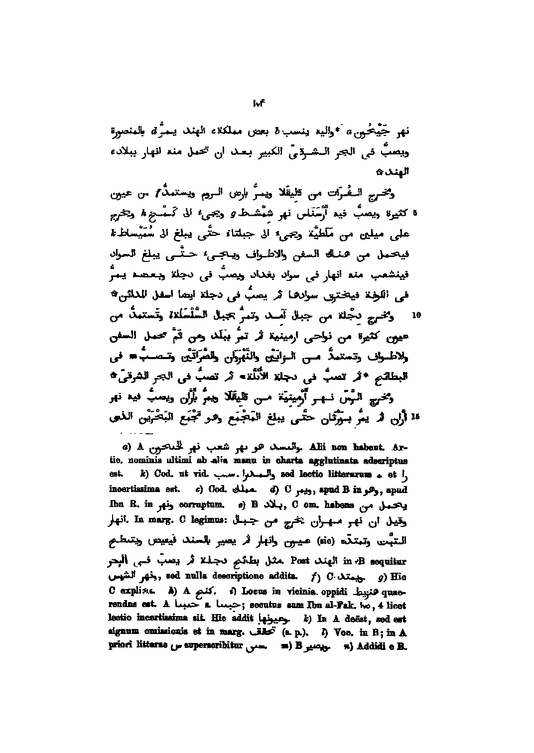 نهر جيحون واليه ينسب بعض مملكة الهند يمرّ بالمنصورة ويصبّ فى الجر الشرقىّ الكبير بعد ان تحمل منه انهار ببلاد الهند ومخرج الفرات من قاليقلا ويمرّ بارض الروم ويستمدّ من عيون كثيرة ويصبّ فيه أرسناس نهر شمشاط ويجيء الى كمخ ويخرج على ميلين من ملطيّة ويجيء الى جبلتا حتّى يبلغ الى سميساط فيحمل من هناك السفن والاطواف ويجيء حتّى يبلغ السواد فينشعب منه انهار فى سواد بغداد ويصبّ فى دجلة وبعضه يمرّ فى الكوفة فيخترق سوادها ثم يصبّ فى دجلة ايضا اسفل المدائن ومخرج دجلة من جبال آمد وتمرّ بجبال السّلسلة وتستمدّ من عيون كثيرة من نواحى ارمينية ثم تمرّ ببلد ومن ثمّ؟ حمل السفن ولا طواف وتستمدّ من الزابين والنّهروان والصّراتين وتصبّ فى البطائح ثم تصبّ فى دجلة الأ؟ لّة ثم تصبّ فى الجر الشرقىّ ومخرج الرّسّ نهر أرمينية من قاليقلا ويمرّ بأرّان ويصبّ فيه نهر ارّان ثم يمرّ بورثان حتّى يبلغ المجمع وهو مجمع البحرين الذي