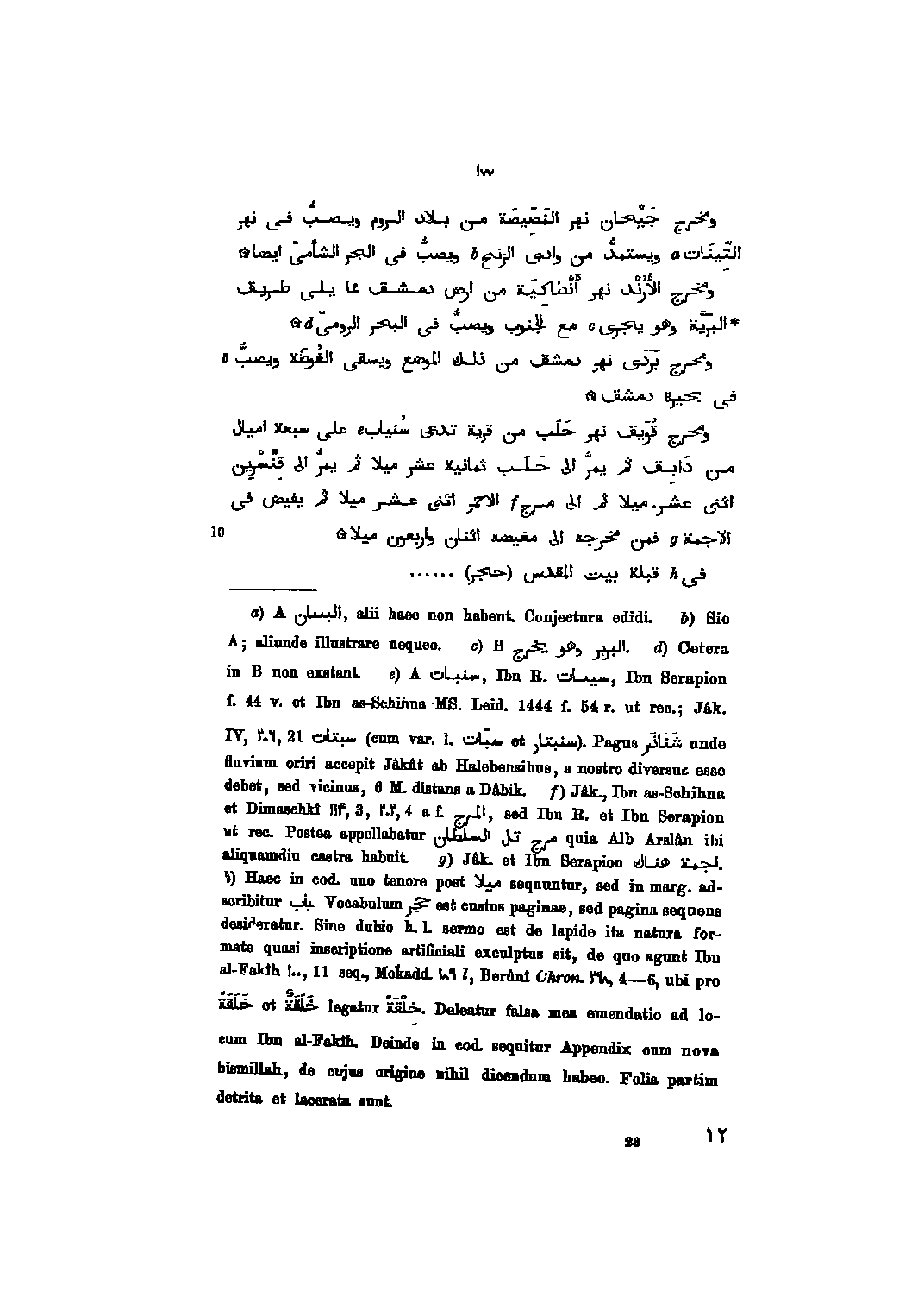 ومخرج جيحان نهر المصّيصة من بلاد الروم ويصبّ فى نهر التّينات ويستمدّ من وادى الزنج ويصبّ فى الجر الشأمىّ ايضا ومخرج الأرند نهر أنطاكية من ارض دمشق مما يلى طريق البرّيّة وهو يجرى مع الجنوب ويصبّ فى البحر الرومىّ ومخرج بردى نهر دمشق من ذلك الموضع ويسقى الغوطة ويصبّ فى بحيرة دمشق ومخرج قويق نهر حلب من قرية تدعى سنياب على سبعة اميال من دابق ثم يمرّ الى حلب ثمانية عشر ميلا ثم يمرّ الى قنّسرين اثنى عشر. ميلا ثم الى مرج الاحمر اثنى عشر ميلا ثم يفيض فى الاجمة فمن مخرجه الى مغيضه اثنان واربعون ميلا فى قبلة بيت المقدس (حجر) .....