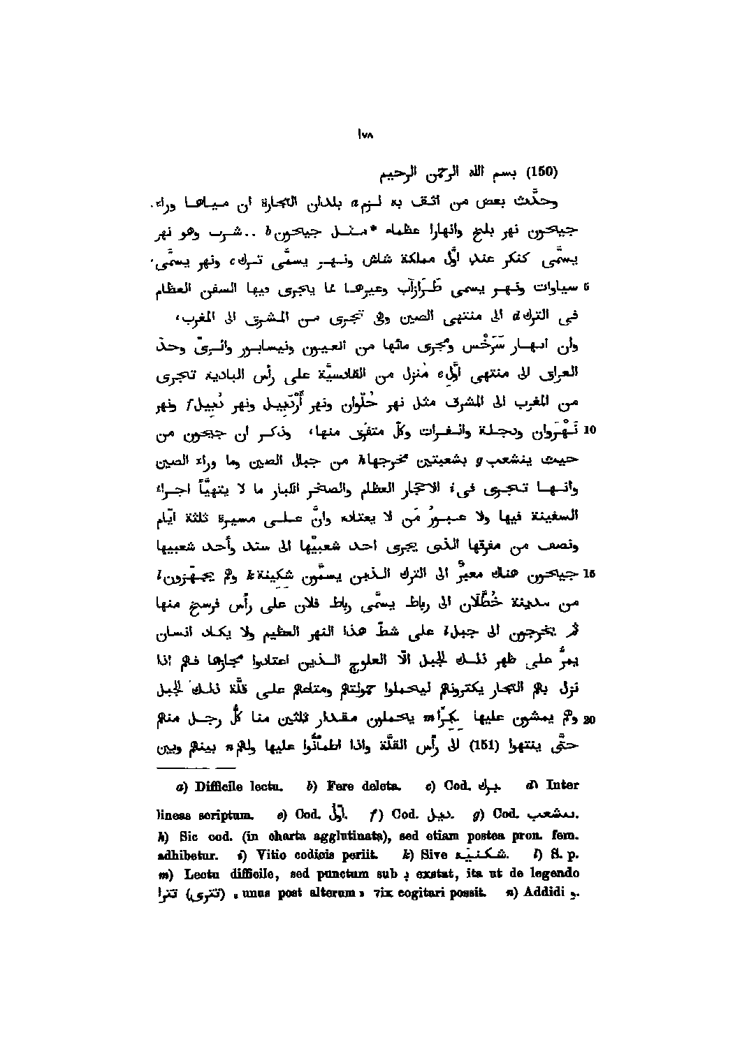 (150) بسم الله الرحمن الرحيم وحدّث بعض من اثق به لزم بلدان التجارة ان مياها وراء جيحون نهر بلخ وانهارا عظماء مثل جيحون.. شرب وهو نهر يسمّى كنكر عند اوّل مملكة شاش ونهر يسمّى ترك ونهر يسمّى سياوات ونهر يسمى طرازآب وعيرها مما يجرى فيها السفن العظام فى الترك الى منتهى الصين وهى تجرى من المشرق الى المغرب، وان انهار سرخس ومجرى مائها من العيون ونيسابور والرىّ وحدّ العراق الى منتهى اوّل منزل من القادسيّة على رأس البادية تجرى من المغرب الى المشرق مثل نهر حلوان ونهر أردبيل ونهر دبيل ونهر نهروان ودجلة والفرات وكلّ متفرق منها، وذكر ان جيحون من حيث ينشعب بشعبتين مخرجها من جبال الصين وما وراء الصين وانها تجرى فى الاحجار العظام والصخر الكبار ما لا يتهيّأ اجراء السفينة فيها ولا عبور من لا يعتاده وانّ على مسيرة ثلثة ايّام ونصف من مفرقها الذي يجرى احد شعبيها الى سند وأحد شعبيها جيحون هناك معبر الى الترك الذين يسمّون شكينة وهم يجهّزون من مدينة خطّلان الى رباط يسمّى رباط فلان على رأس فرسخ منها ثم يخرجون الى جبل على شطّ هذا النهر العظيم ولا يكاد انسان يمرّ على ظهر ذلك الجبل الّا العلوج الذين اعتادوا مجازها فهم اذا نزل بهم التجار يكترونهم ليحملوا حمولتهم ومتاعهم على قلّة ذلك الجبل وهم يمشون عليها؟ كرا يحملون مقدار ثلثين منا كلّ رجل منهم حتّى ينتهوا (151) الى رأس القلّة واذا اطمأنّوا عليها ولهم بينهم وبين