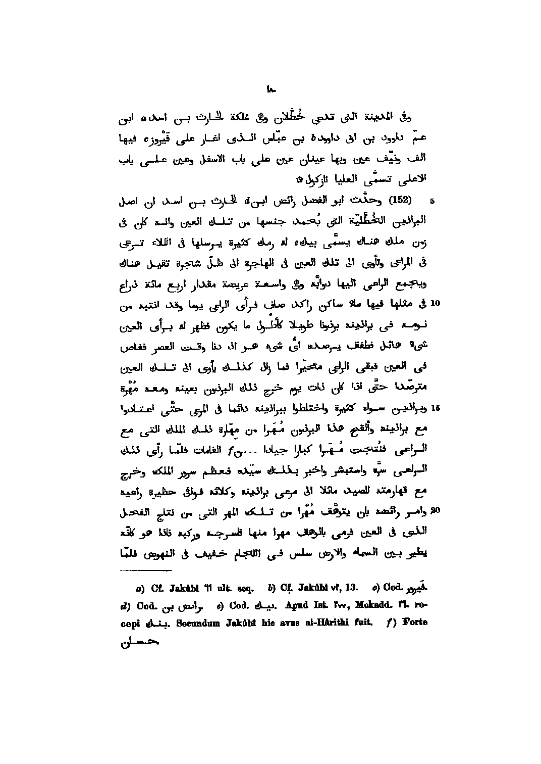 وفى المدينة التى تدعى خطّلان وهى مملكة الحارث بن اسد ابن عمّ داوود بن ابى داوود بن عبّاس الذي اغار على فيروز فيها الف ونيّف عين وبها عينان عين على باب الاسفل وعين على باب الاعلى تسمّى العليا نازكول (152) وحدّث ابو الفضل رائض ابن الحارث بن اسد ان اصل البراذين الخطّليّة التى يحمد جنسها من تلك العين وانه كان فى زمن ملك هناك يسمّى بيك له رمك كثيرة يرسلها فى الكلاء ترعى فى المراعى وتأوى الى تلك العين فى الهاجرة الى ظلّ شجرة تقيل هناك ويجمع الراعى اليها دوابّه وهى واسعة عريضة مقدار اربع مائة ذراع فى مثلها فيها ماء ساكن راكد صاف فرأى الراعى يوما وقد انتبه من نومه فى براذينه برذونا طويلا كأطول ما يكون فظهر له برأى العين شىء هائل فطفق يرصده اىّ شىء هو اذ دنا وقت العصر فغاص فى العين فبقى الراعى متحيّرا فما زال كذلك يأوى الى تلك العين مترصّدا حتّى اذا كان ذات يوم خرج ذلك البرذون بعينه ومعه مهرة وبراذين سواه كثيرة واختلطوا ببراذينه دائما فى المرعى حتّى اعتادوا مع براذينه وألقح هذا البرذون مهرا من مهارة ذلك الملك التى مع الراعى فنتجت مهرا كبارا جيادا ... ن القامات فلمّا رأى ذلك الراعى سرّه واستبشر واخبر بذلك سيّده فعظم سرور الملك وخرج مع قهارمته للصيد مائلا الى مرعى براذينه وكلائه فوافى حظيرة راعيه وامر رائضه بان يتوهّق مهرا من تلك المهر التى من نتاج الفحل الذي فى العين فرمى بالوهق مهرا منها فاسرجه وركبه فاذا هو كانّه يطير بين السماء والارض سلس فى اللجام خفيف فى النهوض فلمّا