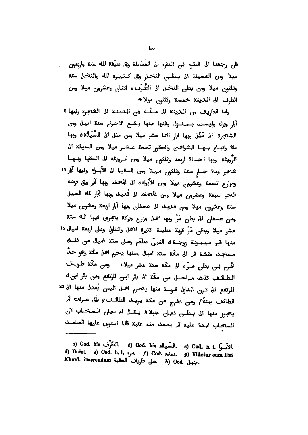 فان رجعنا الى النقرة فمن النقرة الى العسيلة وهى ضيّقة الماء ستة واربعون ميلا ومن العسيلة الى بطن النخل وهى كثيرة الماء والنخل ستة وثلثون ميلا ومن بطن النخل الى الطّرف اثنان وعشرون ميلا ومن الطرف الى المدينة خمسة وثلثون ميلا واما الطريق من المدينة الى مكّة فمن المدينة الى الشجرة وفيها آبار وبرك وليست بمنزل ولكنها منها يقع الاحرام ستة اميال ومن الشجرة الى ملل وبها آبار اثنا عشر ميلا ومن ملل الى السّيالة وبها ماء وتباع بها الشواهين والصقور تسعة عشر ميلا ومن السيالة الى الرّويثة وبها احساء اربعة وثلثون ميلا ومن الرويثة الى السقيا وبها شجر وماء جار ستة وثلثون ميلا ومن السقيا الى الأبواء وفيها آبار ومزارع تسعة وعشرون ميلا ومن الأبواء الى الجحفة وبها آبار وهى فرضة الجر سبعة وعشرون ميلا ومن الجحفة الى قديد وبها آبار لماء السيل ستة وعشرون ميلا ومن قديد الى عسفان وبها آبار اربعة وعشرون ميلا ومن عسفان الى بطن مرّ وبها نخل وزرع وبركة يجرى فيها الماء ستة عشر ميلا وبطن مرّ قرية عظيمة كثيرة الاهل والمنازل وعلى اربعة اميال منها قبر ميمونة زوجة النّبيّ - صلى الله عليه وسلم - وعلى ستة اميال من ذلك مسجد عائشة ثم الى مكّة ستة اميال ومنها يحرم اهل مكّة وهو حدّ الحرم فمن بطن مرّ الى مكّة ستة عشر ميلا، ومن مكّة طريق الطائف ثلث مراحل من مكّة الى بئر ابن المرتفع ومن بئر ابن المرتفع الى قرن المنازل قرية منها يحرم اهل اليمن يعدل منها الى الطائف يمنة ومن يخرج من مكة يريد الطائف يأتى عرفات ثم يجوز منها الى بطن نعمان جبلا يقال له نعمان السحاب لان السحاب ابدا عليه ثم يصعد منه عقبة فاذا استوى عليها الصاعد