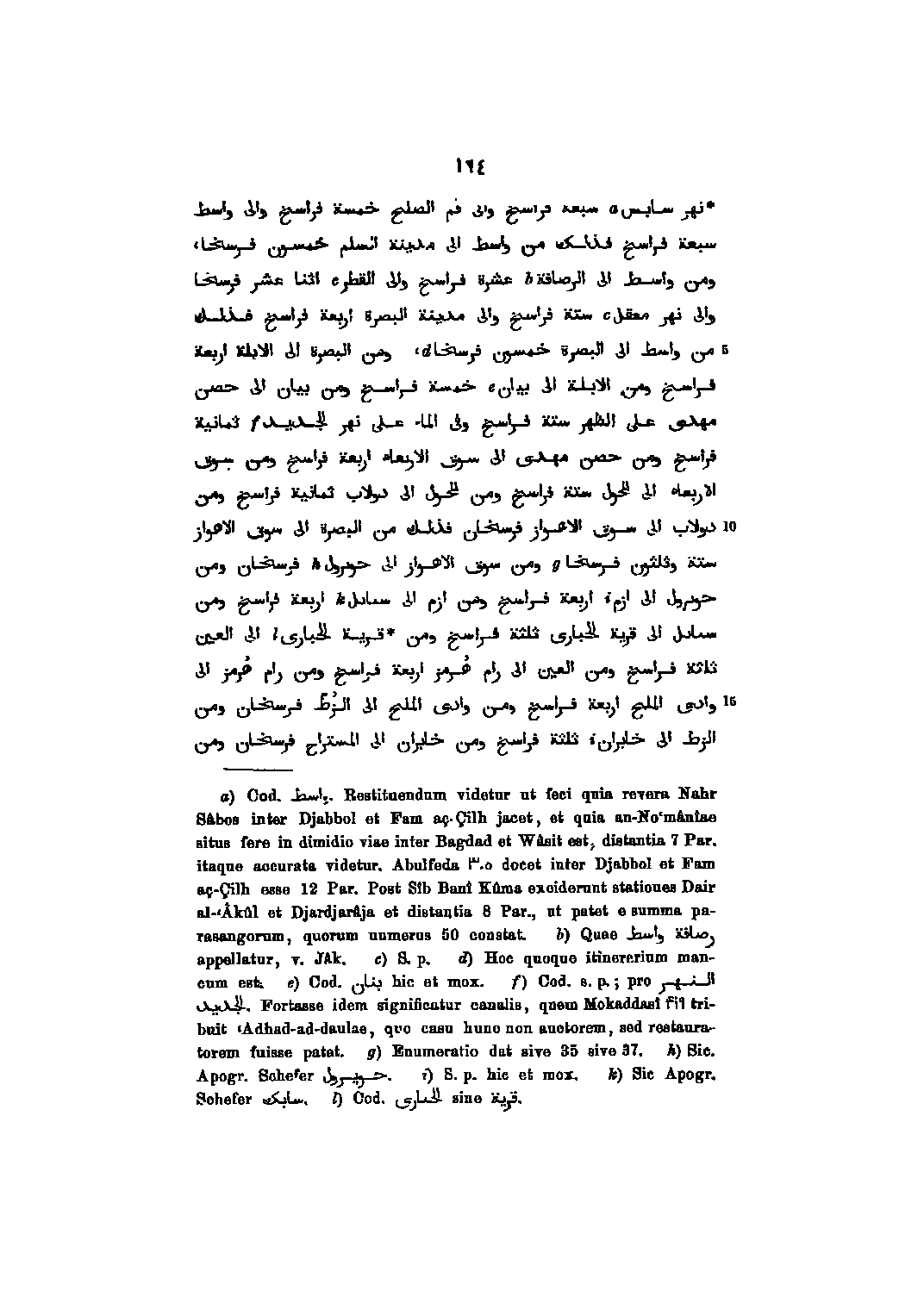نهر سابس سبعه فراسخ والى فم الصلح خمسة فراسخ والى واسط سبعة فراسخ فذلك من واسط الى مدينة السلم خمسون فرسخا، ومن واسط الى الرصافة عشرة فراسخ والى القطر اثنا عشر فرسخا والى نهر معقل ستة فراسخ والى مدينة البصرة اربعة فراسخ فذلك من واسط الى البصرة خمسون فرسخا، ومن البصرة الى الابلة اربعة فراسخ ومن الابلة الى بيان خمسة فراسخ ومن بيان الى حصن مهدى على الظهر ستة فراسخ وفى الماء على نهر الجديد ثمانية فراسخ ومن حصن مهدى الى سوق الاربعاء اربعة فراسخ ومن سوق الاربعاء الى المحول ستة فراسخ ومن المحول الى دولاب ثمانية فراسخ ومن دولاب الى سوق الاهواز فرسخان فذلك من البصرة الى سوق الاهواز ستة وثلثون فرسخا ومن سوق الاهواز الى حو؟ رول فرسخان ومن حو؟ رول الى ازم اربعة فراسخ ومن ازم الى س؟ ا؟ ل اربعة فراسخ ومن س؟ ا؟ ل الى قرية الحبارى ثلثة فراسخ ومن قرية الحبارى الى العين ثلثة فراسخ ومن العين الى رام هرمز اربعة فراسخ ومن رام هرمز الى وادى الملح اربعة فراسخ ومن وادى الملح الى الزطّ فرسخان ومن الزط الى خابران ثلثة فراسخ ومن خابران الى المستراح فرسخان ومن