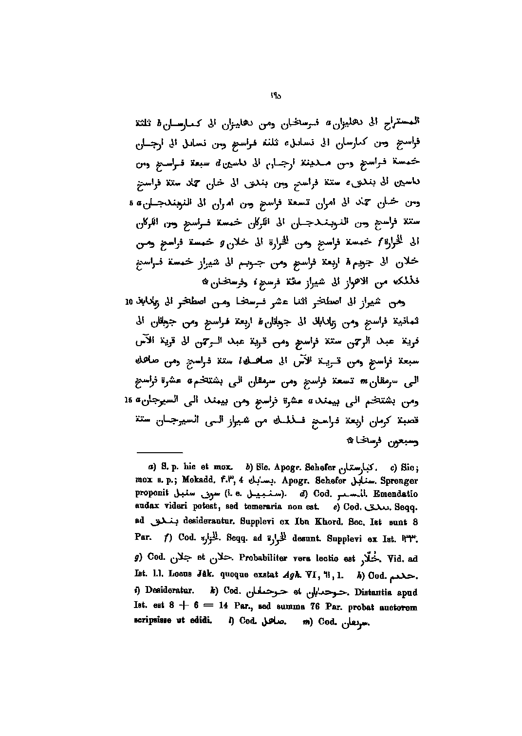 المستراح الى دهليزان فرسخان ومن دهليزان الى ك؟ ارسان ثلثة فراسخ ومن ك؟ ارسان الى نسا؟ ل ثلثة فراسخ ومن نسائل الى ارجان خمسة فراسخ ومن مدينة ارجان الى داسين سبعة فراسخ ومن داسين الى بندق ستة فراسخ ومن بندق الى خان حماد ستة فراسخ ومن خان حماد الى امران تسعة فراسخ ومن امران الى النوبندجان ستة فراسخ ومن النوبندجان الى الكركان خمسة فراسخ ومن الكركان الى الخرارة خمسة فراسخ ومن الخرارة الى خلان خمسة فراسخ ومن خلان الى جويم اربعة فراسخ ومن جويم الى شيراز خمسة فراسخ فذلك من الاهواز الى شيراز مائة فرسخ وفرسخان ومن شيراز الى اصطخر اثنا عشر فرسخا ومن اصطخر الى زياداباذ ثمانية فراسخ ومن زياداباذ الى جوبانان اربعة فراسخ ومن جوبانان الى قرية عبد الرحمن ستة فراسخ ومن قرية عبد الرحمن الى قرية الآس سبعة فراسخ ومن قرية الآس الى صاهك ستة فراسخ ومن صاهك الى سرمقان تسعة فراسخ ومن سرمقان الى بشتخم عشرة فراسخ ومن بشتخم الى بيمند عشرة فراسخ ومن بيمند الى السيرجان قصبة كرمان اربعة فراسخ فذلك من شيراز الى السيرجان ستة وسبعون فرسخا