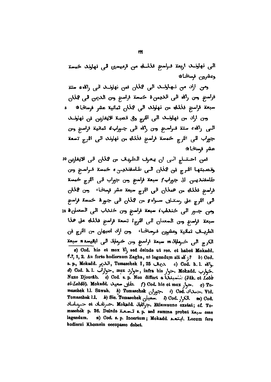 الى نهاوند اربعة فراسخ فذلك من قرميسين الى نهاوند خمسة وعشرون فرسخا ومن اراد من نهاوند الى همذان فمن نهاوند الى راكاه ستة فراسخ ومن راكاه الى الديمن خمسة فراسخ ومن الديمن الى همذان سبعة فراسخ فذلك من نهاوند الى همذان ثمانية عشر فرسخا ومن اراد من نهاوند الى الكرج وهى قصبة الايغارين فمن نهاوند الى راكاه ستة فراسخ ومن راكاه الى جوراب ثمانية فراسخ ومن جوراب الى الكرج خمسة فراسخ فذلك من نهاوند الى الكرج تسعة عشر فرسخا فمن احتاج الى ان يعرف الطريق من همذان الى الايغارين وقصبتها الكرج فمن همذان الى طاسفندين خمسة فراسخ ومن طاسفندين الى جوراب سبعة فراسخ ومن جوراب الى الكرج خمسة فراسخ فذلك من همذان الى الكرج سبعة عشر فرسخا، ومن همذان الى الكرج على رستاق سواه من همذان الى جور خمسة فراسخ ومن جور الى خنداب سبعة فراسخ ومن خنداب الى السع؟ ان سبعة فراسخ ومن السع؟ ان الى الكرج تسعة فراسخ فذلك على هذا الطريق ثمانية وعشرون فرسخا، ومن اراد اصبهان من الكرج فمن الكرج الى خرماباذ سبعة فراسخ ومن خرماباذ الى ابقيسه سبعة