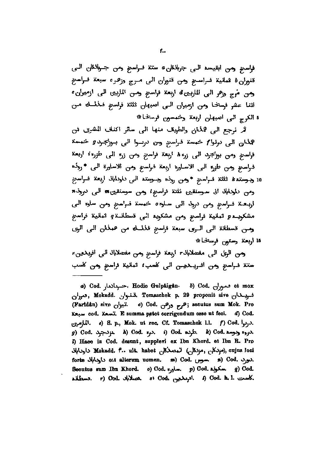 فراسخ ومن ابقيسه الى جرباذقان ستة فراسخ ومن جرباذقان الى قنوران ثمانية فراسخ ومن قنوران الى مرج وزهر سبعة فراسخ ومن مرج وزهر الى الماربين اربعة فراسخ ومن الماربين الى ازميران اثنا عشر فرسخا ومن ازميران الى اصبهان ثلثة فراسخ فذلك من الكرج الى اصبهان اربعة وخمسون فرسخا ثم نرجع الى همذان والطريق منها الى سائر اكناف المشرق فمن همذان الى درنوا خمسة فراسخ ومن درنوا الى بوزنجرد خمسة فراسخ ومن بوزنجرد الى زره اربعة فراسخ ومن زره الى طزره اربعة فراسخ ومن طزره الى الاساورة اربعة فراسخ ومن الاساورة الى روذه وبوسته ثلثة فراسخ ومن روذه وبوسته الى داوداباذ اربعة فراسخ ومن داوداباذ الى سوسنقين ثلثة فراسخ ومن سوسنقين الى دروذ اربعة فراسخ ومن دروذ الى ساوه خمسة فراسخ ومن ساوه الى مشكويه ثمانية فراسخ ومن مشكويه الى قسطانة ثمانية فراسخ ومن قسطانة الى الرى سبعة فراسخ فذلك من همذان الى الرى اربعة وستون فرسخا ومن الرى الى مفضلاباذ اربعة فراسخ ومن مفضلاباذ الى افريدين ستة فراسخ ومن افريدين الى كاسب ثمانية فراسخ ومن كاسب
