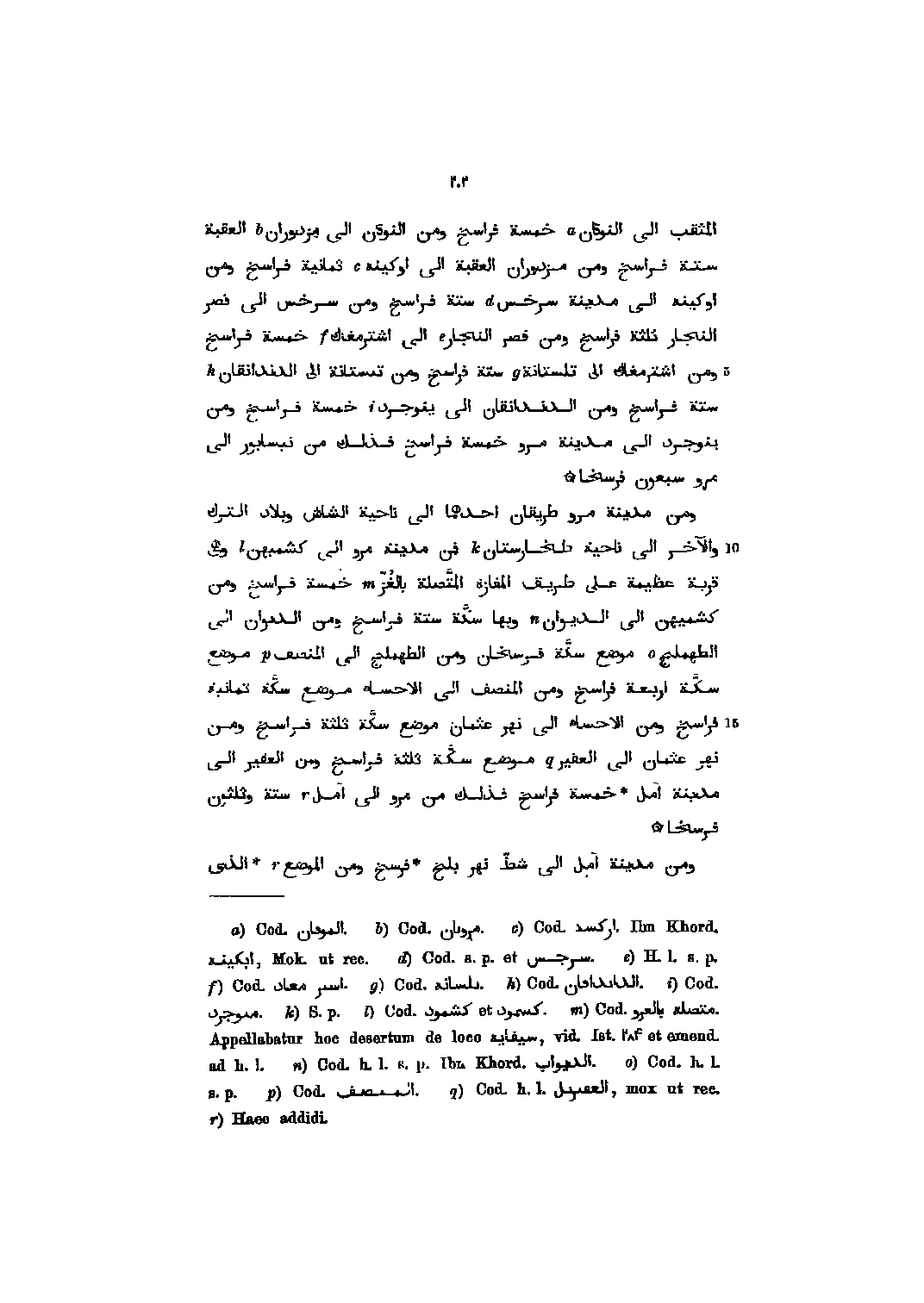 المثقب الى النوقان خمسة فراسخ ومن النوقان الى مزدوران العقبة ستة فراسخ ومن مزدوران العقبة الى اوكينه ثمانية فراسخ ومن اوكينه الى مدينة سرخس ستة فراسخ ومن سرخس الى قصر النجار ثلثة فراسخ ومن قصر النجار الى اشترمغاك خمسة فراسخ ومن اشترمغاك الى تلستانة ستد فراسخ ومن ت؟ ستانة الى الدندانقان ستة فراسخ ومن الدندانقان الى ينوجرد خمسة فراسخ ومن ينوجرد الى مدينة مرو خمسة فراسخ فذلك من نيسابور الى مرو سبعون فرسخا ومن مدينة مرو طريقان احدهما الى ناحية الشاش وبلاد الترك والآخر الى ناحية طخارستان فمن مدينة مرو الى كشميهن وهى قرية عظيمة على طريق المفازة المتّصلة بالغزّ خمسة فراسخ ومن كشميهن الى الديوان وبها سكّة ستة فراسخ ومن الديوان الى الطهملج موضع سكّة فرسخان ومن الطهملج الى المنصف موضع سكّة اربعة فراسخ ومن المنصف الى الاحساء موضع سكّة ثمانية فراسخ ومن الاحساء الى نهر عثمان موضع سكّة ثلثة فراسخ ومن نهر عثمان الى العقير موضع سكّة ثلثة فراسخ ومن العقير الى مدينة آمل خمسة فراسخ فذلك من مرو الى آمل ستة وثلثون فرسخا ومن مدينة آمل الى شطّ نهر بلخ فرسخ ومن الموضع الذي