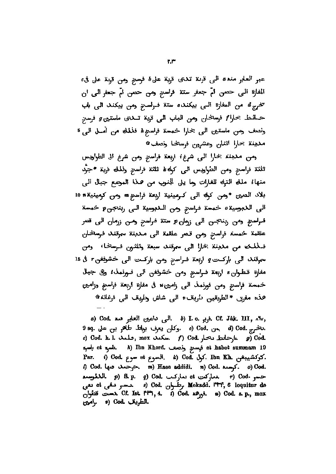 عبر العابر منه الى قرية تدعى قرية على فرسخ ومن قرية على فى المفازة الى حصن امّ جعفر ستة فراسخ ومن حصن امّ جعفر الى ان تخرج من المفازة الى بيكند ستة فراسخ ومن بيكند الى باب حائط بخارا فرسخان ومن الباب الى قرية تدعى ماستين فرسخ ونصف ومن ماستين الى بخارا خمسة فراسخ فذلك من آمل الى مدينة بخارا اثنان وعشرون فرسخا ونصف ومن مدينة بخارا الى شرغ اربعة فراسخ ومن شرغ الى الطواويس ثلثة فراسخ ومن الطواويس الى كوك ثلثة فراسخ وذلك قرية جرّد منها ملك الترك للغارات وما يلى الجنوب من هذا الموضع جبال الى بلاد الصين ومن كوك الى كرمينية اربعة فراسخ ومن كرمينية الى الدبوسية خمسة فراسخ ومن الدبوسية الى ربنجن خمسة فراسخ ومن ربنجن الى زرمان ستة فراسخ ومن زرمان الى قصر علقمة خمسة فراسخ ومن قصر علقمة الى مدينة سمرقند فرسخان فذلك من مدينة بخارا الى سمرقند سبعة وثلثون فرسخا، ومن سمرقند الى باركت اربعة فراسخ ومن باركت الى خشوفغن فى مفازة قطوان اربعة فراسخ ومن خشوفغن الى فورنمذ وهى جبال خمسة فراسخ ومن فورنمذ الى زامين فى مفازة اربعة فراسخ وزامين هذه مفرق الطريقين طريق الى شاش وطريق الى فرغانة