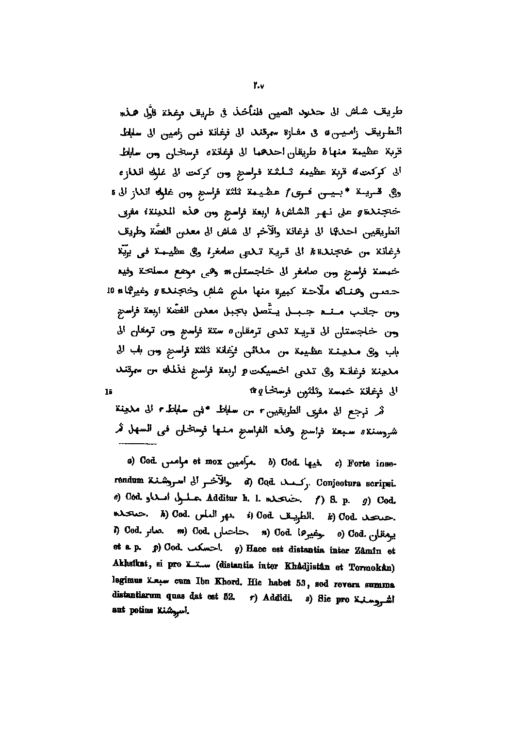 طريق شاش الى حدود الصين فلنأخذ فى طريق فرغانة فاوّل هذه الطريق زامين فى مفازة سمرقند الى فرغانة فمن زامين الى ساباط قرية عظيمة منها طريقان احدهما الى فرغانة فرسخان ومن ساباط الى كركت قرية عظيمة ثلثة فراسخ ومن كركت الى غلوك انداز وهى قرية بين قرى عظيمة ثلثة فراسخ ومن غلوك انداز الى خجندة على نهر الشاش اربعة فراسخ ومن هذه المدينة مفرق الطريقين احدهما الى فرغانة والآخر الى شاش الى معدن الفضّة وطريق فرغانة من خجندة الى قرية تدعى صامغر وهى عظيمة فى برّيّة خمسة فراسخ ومن صامغر الى خاجستان وهى موضع مسلحة وفيه حصن وهناك ملّاحة كبيرة منها ملح شاش وخجندة وغيرهما ومن جانب منه جبل يتّصل بجبل معدن الفضّة اربعة فراسخ ومن خاجستان الى قرية تدعى ترمقان ستة فراسخ ومن ترمقان الى باب وهى مدينة عظيمة من مدائن فرغانة ثلثة فراسخ ومن باب الى مدينة فرغانة وهى تدعى اخسيكت اربعة فراسخ فذلك من سمرقند الى فرغانة خمسة وثلثون فرسخا ثم نرجع الى مفرق الطريقين من ساباط فمن ساباط الى مدينة شروسنة سبعة فراسخ وهذه الفراسخ منها فرسخان فى السهل ثم