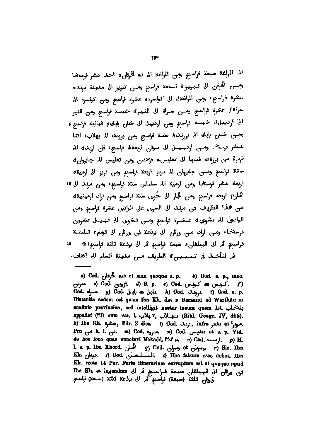 الى المراغة سبعة فراسخ ومن المراغة الى ده الخرقان احد عشر فرسخا ومن الخرقان الى تبريز تسعة فراسخ ومن تبريز الى مدينة مرند عشرة فراسخ، ومن المراغة الى كولسره عشرة فراسخ ومن كولسره الى سراة عشرة فراسخ ومن سراة الى النير خمسة فراسخ ومن النير الى اردبيل خمسة فراسخ ومن اردبيل الى خان بابك ثمانية فراسخ ومن خان بابك الى برزند ستة فراسخ ومن برزند الى بهلاب اثنا عشر فرسخا ومن اردبيل الى موقان اربعة فراسخ، فان اريد الى نريز من برزة فمنها الى تفليس فرسخان ومن تفليس الى جابروان ستة فراسخ ومن جابروان الى نريز اربعة فراسخ ومن نريز الى ارمية اربعة عشر فرسخا ومن ارمية الى سلماس ستة فراسخ، ومن مرند الى الجار اربعة فراسخ ومن الجار الى خوى ستة فراسخ ومن اراد ارمينية من هذا الطريق فمن مرند الى السرى على الوادى عشرة فراسخ ومن الوادى الى؟ شوى عشرة فراسخ ومن نشوى الى دبيل عشرون فرسخا، ومن اراد من ورثان الى برذعة فمن ورثان الى قومام ثلثة فراسخ ثم الى البيلقان سبعة فراسخ ثم الى برذعة ثلثة فراسخ ثم لنأخذ فى تبيين الطريق من مدينة السلم الى اكتاف