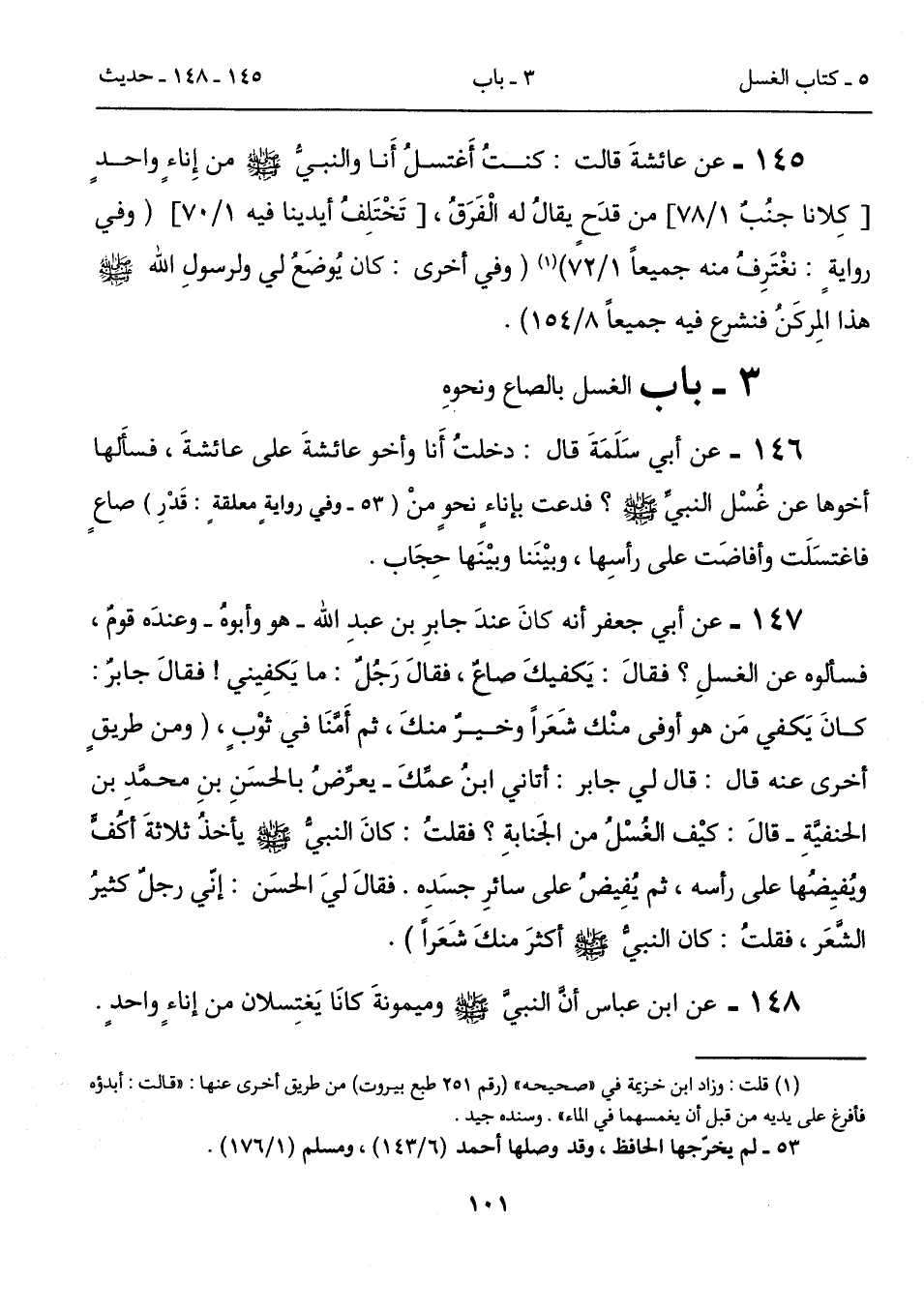 147 - عن أبي جعفر أنه كانَ عندَ جابرِ بن عبدِ الله- هو وأبوهُ- وعندَه قومٌ، فسألوه عن الغسلِ؟ فقالَ: يَكفيكَ صاعٌ، فقالَ رَجُلٌ: ما يَكفِيني! فقالَ جابرٌ: كانَ يَكفي مَن هو أوفى منْك شَعَراً وخيرٌ منكَ، ثم أَمَّنَا في ثوْبٍ، (ومن طريقٍ أخرى عنه قال: قال لي جابر: أتاني ابنُ عمِّكَ- يعرِّضُ بالحسَنِ بنِ محمَّدِ بن الحنفيَّةِ- قالَ: كيْف الغُسْلُ من الجَنابةِ؟ فقلتُ: كانَ النبيُّ - صلى الله عليه وسلم - يأخذُ ثلاثةَ أكُفٍّ ويُفيضُها على رأسه، ثم يُفِيضُ على سائرِ جسَدِه. فقالَ ليَ الحسَن: إنّي رجلٌ كثيرُ الشَّعَر، فقلت: كان النبيُّ - صلى الله عليه وسلم - أكثرَ منكَ شَعَراً).