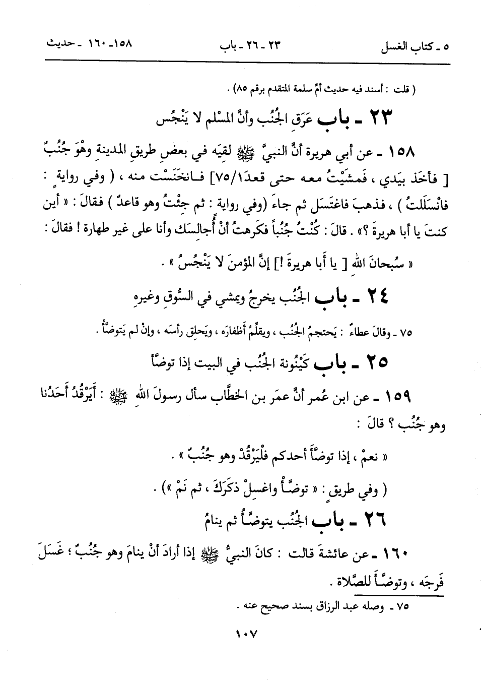 158 - عن أبي هريرة أنَّ النبيَّ- صلى الله عليه وسلم - لقِيَه في بعضِ طريقِ المدينةِ وهْوَ جُنُبٌ [فأخَذ بيَدي، فَمشَيْتُ معه حتى قعدَ 1/ 75] فانخَنَسْت منه، (وفي روايةٍ: فانْسَلَلتُ)، فذهبَ فاغتَسَل ثم جاءَ (وفي روايةٍ: ثم جِئْتُ وهو قاعدٌ) فقالَ: "أين كنتَ يا أبا هريرةَ؟ ". قالَ: كُنْتُ جُنُباً فكَرهتُ أنْ أُجالِسَك وأنا على غير طهارة! فقالَ: " سُبحانَ اللهِ [يا أَبا هريرةَ!] إنَّ المؤمنَ لا يَنْجُسُ".