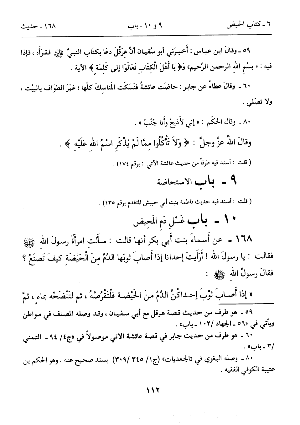 168 - عن أَسماءَ بنت أَبي بكر أنها قالت: سألتِ امرأَةٌ رسولَ الله - صلى الله عليه وسلم - فقالت: يا رسولَ الله! أَرَأَيتَ إحدانا إذا أَصابَ ثوبَها الدَّمُ مِنَ الْحَيْضَةِ كيفَ تَصنَعُ؟ فقالَ رسولُ الله - صلى الله عليه وسلم -: