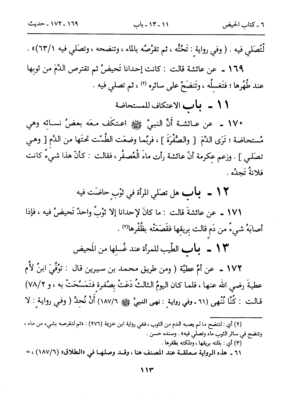 169 - عن عائشة قالت: كانت إحدانا تَحيضُ ثم تقترص الدَّمَ من ثوبِها عند طُهْرها؛ فتَغسِلُه، وتَنضَحُ على سائره (2)، ثم تصلي فيه.