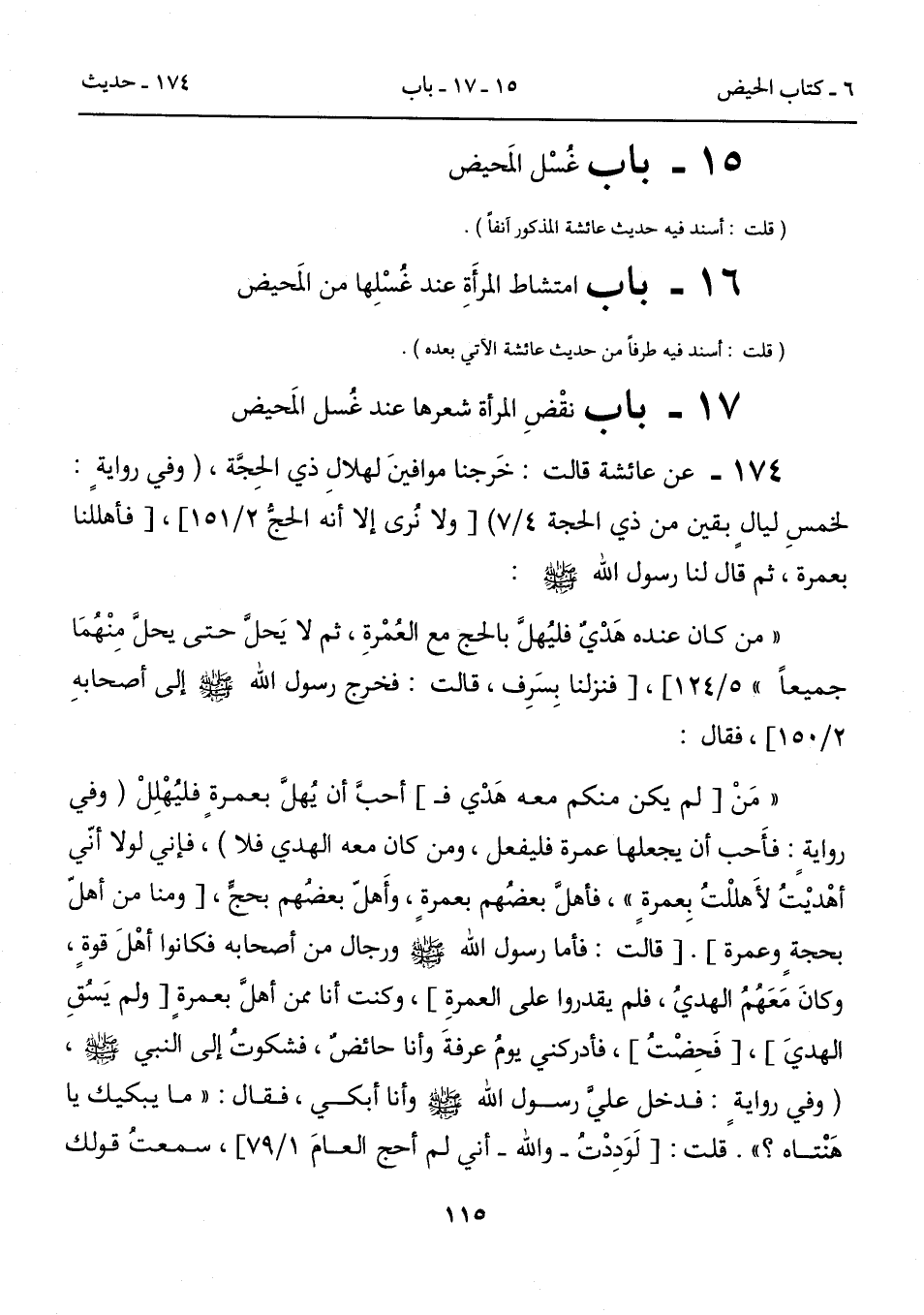 174 - عن عائشة قالت: خَرجنا موافينَ لهلالِ ذي الحِجَّة، (وفي روايةٍ: لخمس ليالٍ بقين من ذي الحجة 4/ 7) [ولا نُرى إلا أنه الحجُّ 2/ 151]، (فأهللنا بعمرة، ثم قًال لنا رسول الله - صلى الله عليه وسلم -: