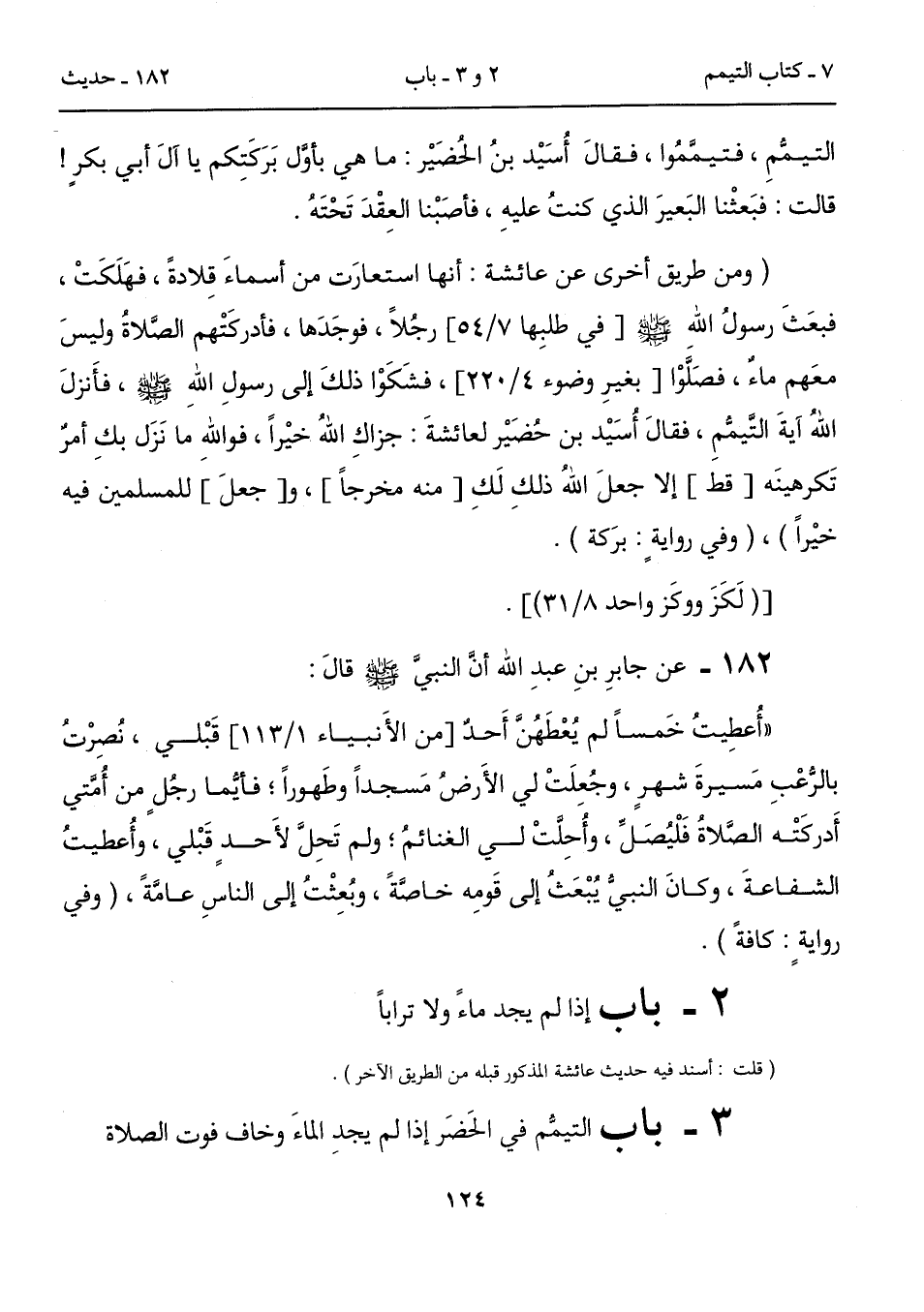 182 - عن جابرِ بنِ عبدِ الله أن النبيَّ - صلى الله عليه وسلم - قالَ: "أُعطِيتُ خَمساً لم يُعْطَهُنَّ أَحدٌ [من الأَنبياء 1/ 113] قَبْلي، نُصِرْتُ بالرُّعْبِ مَسيرةَ شهرٍ، وجُعِلَتْ لي الأَرضُ مَسجداً وطَهوراً، فأيُّما رجُلٍ من أُمَّتي أَدركَتْه الصَّلاةُ فَلْيُصَلِّ، وأُحِلَّتْ لي الغنائمُ؛ ولم تَحِلَّ لأَحدٍ قَبْلي، وأُعطيتُ الشفاعةَ، وكانَ النبيُّ يُبْعَثُ إلى قَومِه خاصَّةً، وبُعِثْتُ إلى الناسِ عامَّةً، (وفي روايةٍ: كافةً).