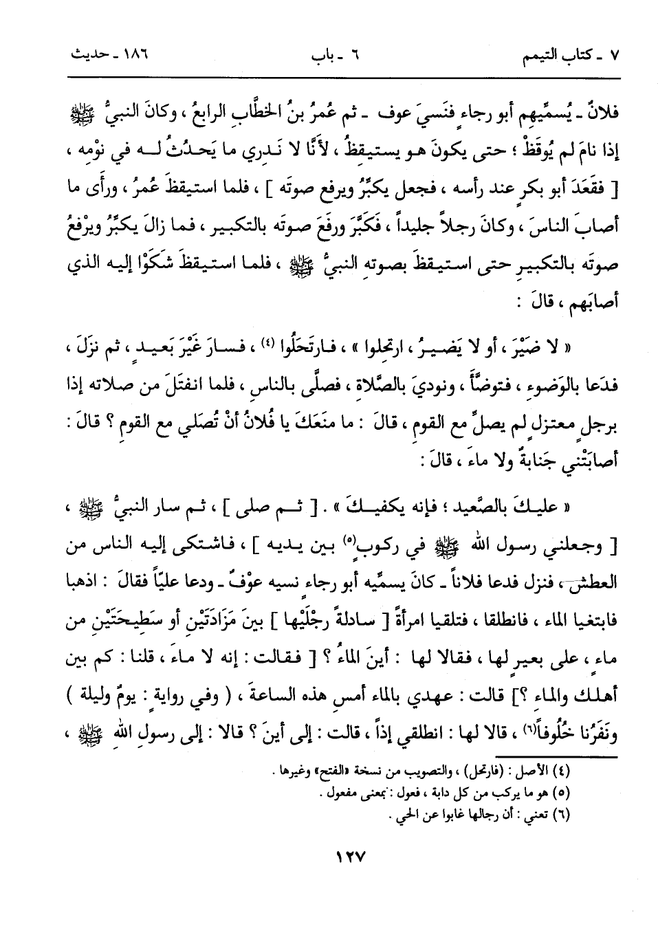 فلانٌ- يُسمِّيهِم أبو رجاءٍ فنَسيَ عوف - ثم عُمرُ بنُ الخطَّابِ الرابعُ، وكانَ النبيُّ - صلى الله عليه وسلم - إذا نامَ لم يُوقَظْ؛ حتى يكونَ هو يستيقِظُ، لأَنَّا لا نَدِري ما يَحدُثُ له في نوْمِه، [فقَعَدَ أبو بكرٍ عند رأسه، فجعل يكبِّرُ ويرفع صوتَه]، فلما استيقظَ عُمرُ، ورأَى ما أصابَ الناسَ، وكانَ رجلاً جليداً، فَكَبَّرَ ورفَعَ صوتَه بالتكبير، فما زالَ يكبِّرُ ويرْفعُ صوتَه بالتكبيرِ حتى استيقظَ بصوتهِ النبيُّ - صلى الله عليه وسلم -، فلما استيقظَ شَكَوْا إليه الذي أصابَهم، قالَ: