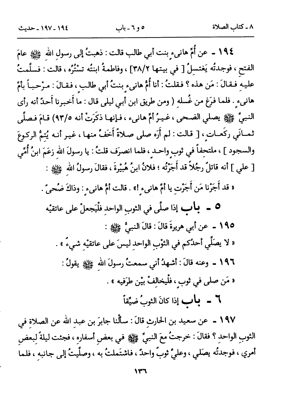 194 - عن أُمِّ هانئٍ بنت أبي طالب قالت: ذهبتُ إلى رسولِ اللهِ - صلى الله عليه وسلم - عامَ الفتحِ، فوجدتُه يَغتسِلُ [في بيتها 2/ 38]، وفاطمةُ ابنتُه تسْتُرُه، قالت: فسلَّمتُ عليهِ فقالَ: مَن هذه؟ فقلتُ: أنا أُمُّ هانئٍ بنتُ أبي طالبٍ، فقالَ: مرْحباً بأمِّ هانئٍ. فلما فرَغ من غُسلهِ (ومن طريق ابن أبي ليلى قال: ما أَخبرنا أَحدٌ أنه رأى النبيَّ - صلى الله عليه وسلم - يصلي الضحى، غيرُ أمِّ هانئ، فإنها ذكَرَتْ أنه 5/ 93) قامَ فصلَّى ثمانيَ ركَعاتٍ، [قالت: لم أَرَه صلى صلاةً أَخَفَّ منها، غير أنه يُتِمُّ الركوعَ والسجود]، ملتحِفاً في ثوبٍ واحدٍ، فلما انصرَف قلتُ: يا رسولَ اللهِ زعَمَ ابنُ أُمِّي [علي] أنه قاتلٌ رجُلاً قد أَجَرْتُه؛ فلانُ ابنُ هُبيْرةَ، فقالَ رسولُ اللهِ - صلى الله عليه وسلم -: