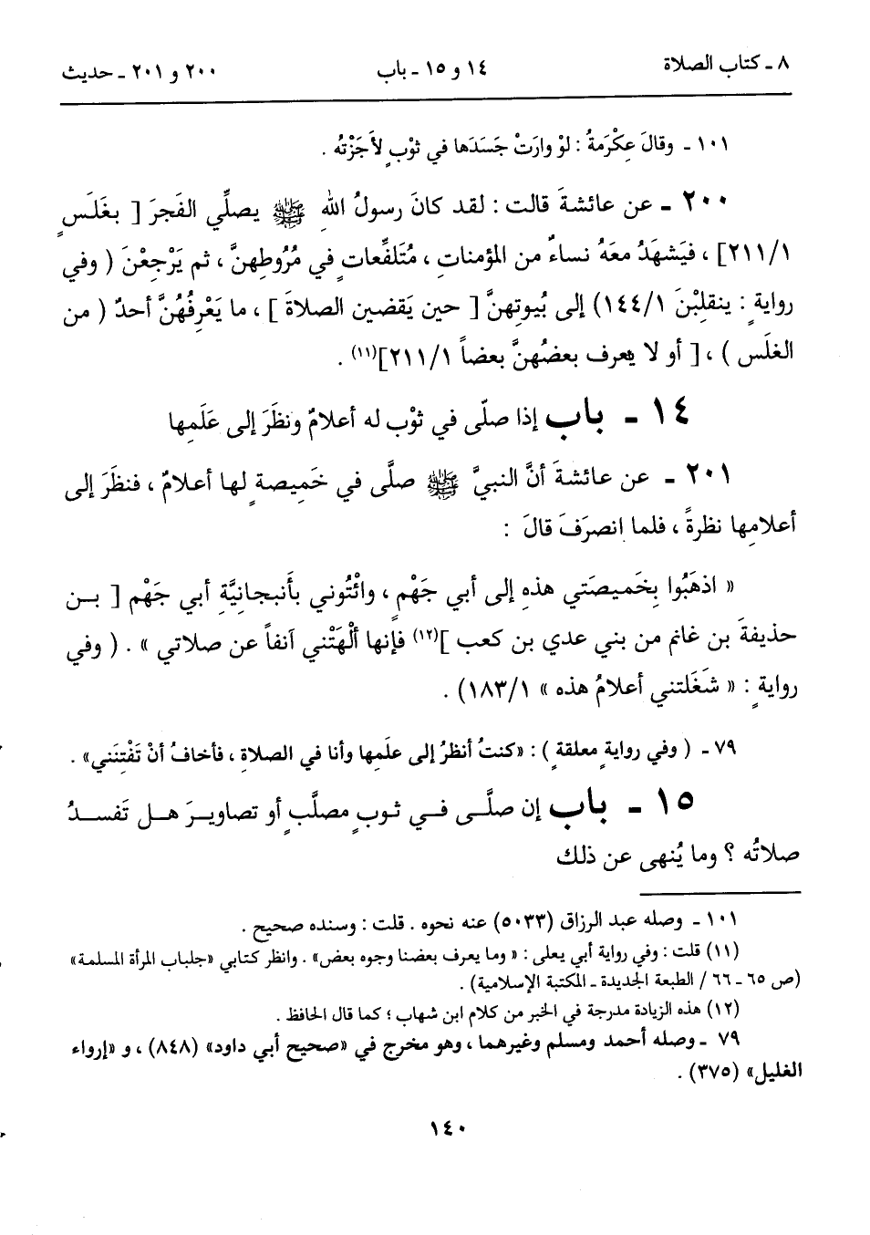 201 - عن عائشةَ أنَّ النبيَّ - صلى الله عليه وسلم - صلَّى في خَمِيصةٍ لها أعلامٌ، فنظَرَ إلى أعلامِها نظرةً، فلما انصرَفَ قالَ: