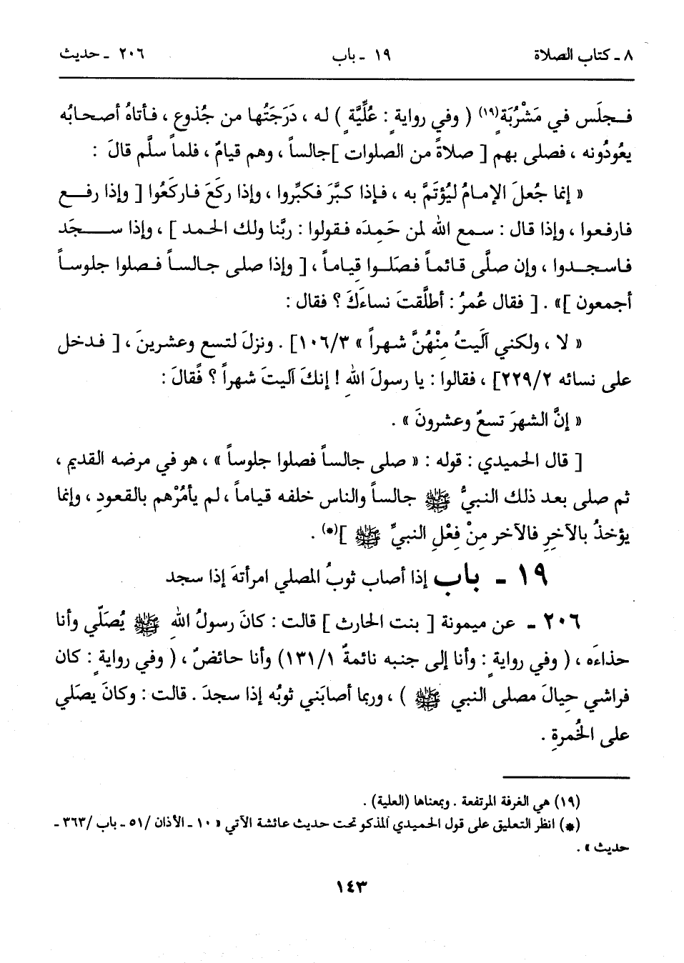 206 - عن ميمونة [بنت الحارث] قالت: كانَ رسولُ الله - صلى الله عليه وسلم - يُصَلّي وأنا حذاءَه، (وفي روايةٍ: وأنا إلى جنبه نائمةٌ 1/ 131) وأنا حائضٌ، (وفي روايةٍ: كان فراشي حِيالَ مصلى النبي - صلى الله عليه وسلم -)، وربما أصابَني ثوبُه إذا سجدَ. قالت: وكانَ يصَلي على الخُمرةِ.