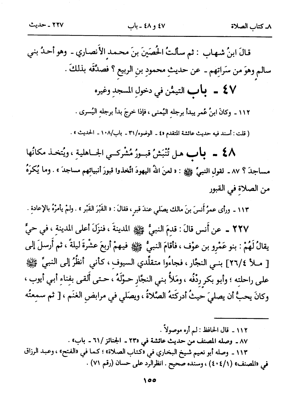 113 - ورأى عمرُ أَنسَ بنَ مالك يصَلي عندَ قبرٍ، فقالَ: "القَبْرَ القَبْر". ولمْ يأمرْهُ بالإعادةِ.