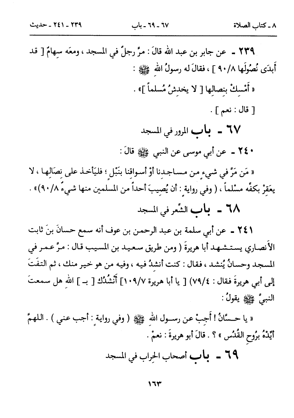 239 - عن جابر بن عبد الله قالَ: مرَّ رجلٌ في المسجد، ومعَه سِهامٌ [قد أَبدَى نُصُولَها 8/ 90]، فقالَ له رسولُ اللهِ - صلى الله عليه وسلم -: