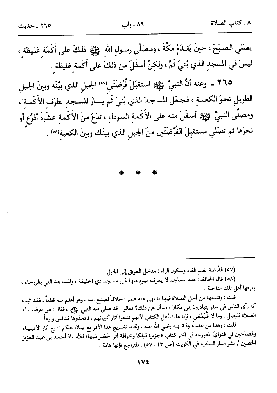 265 - وعنه أنَّ النبيَّ - صلى الله عليه وسلم - استقبَلَ فُرْضَتَيِ (57) الجبلِ الذي بيْنَه وبينَ الجبلِ الطويلِ نحوَ الكعبة، فجعَل المسجدَ الذي بُنيَ ثَم يسارَ المسجدِ بطرَفِ الأَكَمةِ، ومصلَّى النبيِّ - صلى الله عليه وسلم - أسفَلَ منه على الأَكَمةِ السوداءِ، تدَعُ منَ الأَكَمةِ عشَرةَ أذرُعٍ أو نحوَها ثم تصَلي مستقبِلَ الفُرْضَتَين منَ الجبلِ الذي بينَك وبينَ الكعبةِ (58).