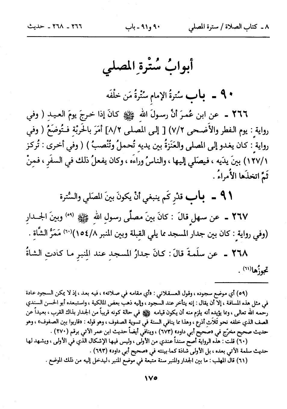 266 - عن ابن عُمرَ أنَّ رسولَ اللهِ - صلى الله عليه وسلم - كانَ إذا خرجَ يومَ العيدِ (وفي روايةٍ: يوم الفطر والأَضحى 2/ 7) [إلى المَصلى 2/ 8] أمَرَ بالحَربْةِ فتُوضَعُ (وفي روايةٍ: كان يغدو إلى المصلى والعَنَزةُ بين يديهِ تُحملُ وتُنْصبُ) (وفي أخرى: تُركز 1/ 127) بينَ يدَيه، فيصَلي إليها، والناسُ وراءَه، وكان يفعلُ ذلك في السفَرِ، فمِنْ ثَمَّ اتخذَها الأُمراءُ.