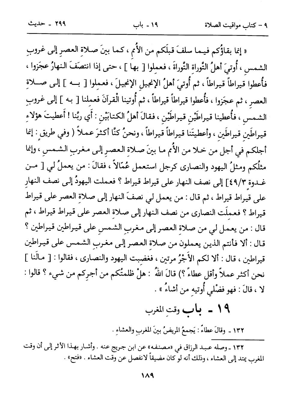 132 - وصله عبد الرزاق في "مصنفه" عن ابن جريج عنه. وأشار بهذا الأثر إلى أن وقت المغرب يمتد إلى العشاء، وذلك أنه لو كان مضيقاً لانفصل عن وقت العشاء. "فتح".