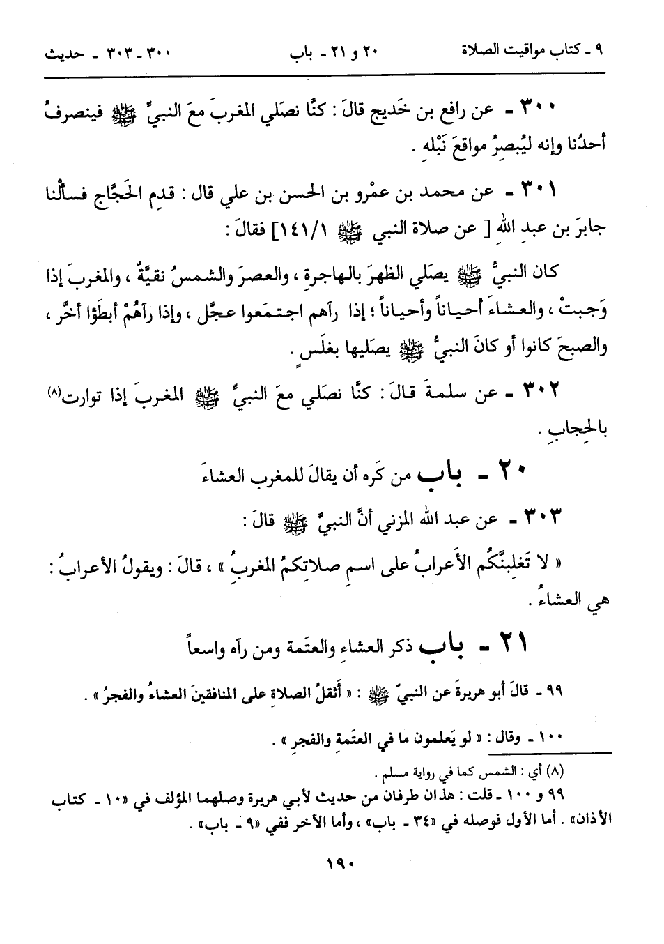 302 - عن سلمةَ قالَ: كنَّا نصَلي معَ النبيِّ - صلى الله عليه وسلم - المغربَ إذا توارت (8) بالحِجابِ.