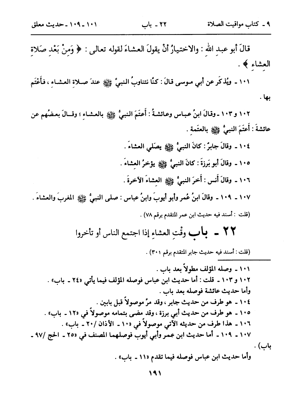 101 - ويُذكَر عن أبي موسى قالَ: كنَّا نتناوبُ النبيَّ - صلى الله عليه وسلم - عندَ صلاةِ العشاءِ، فأَعْتَم بها.