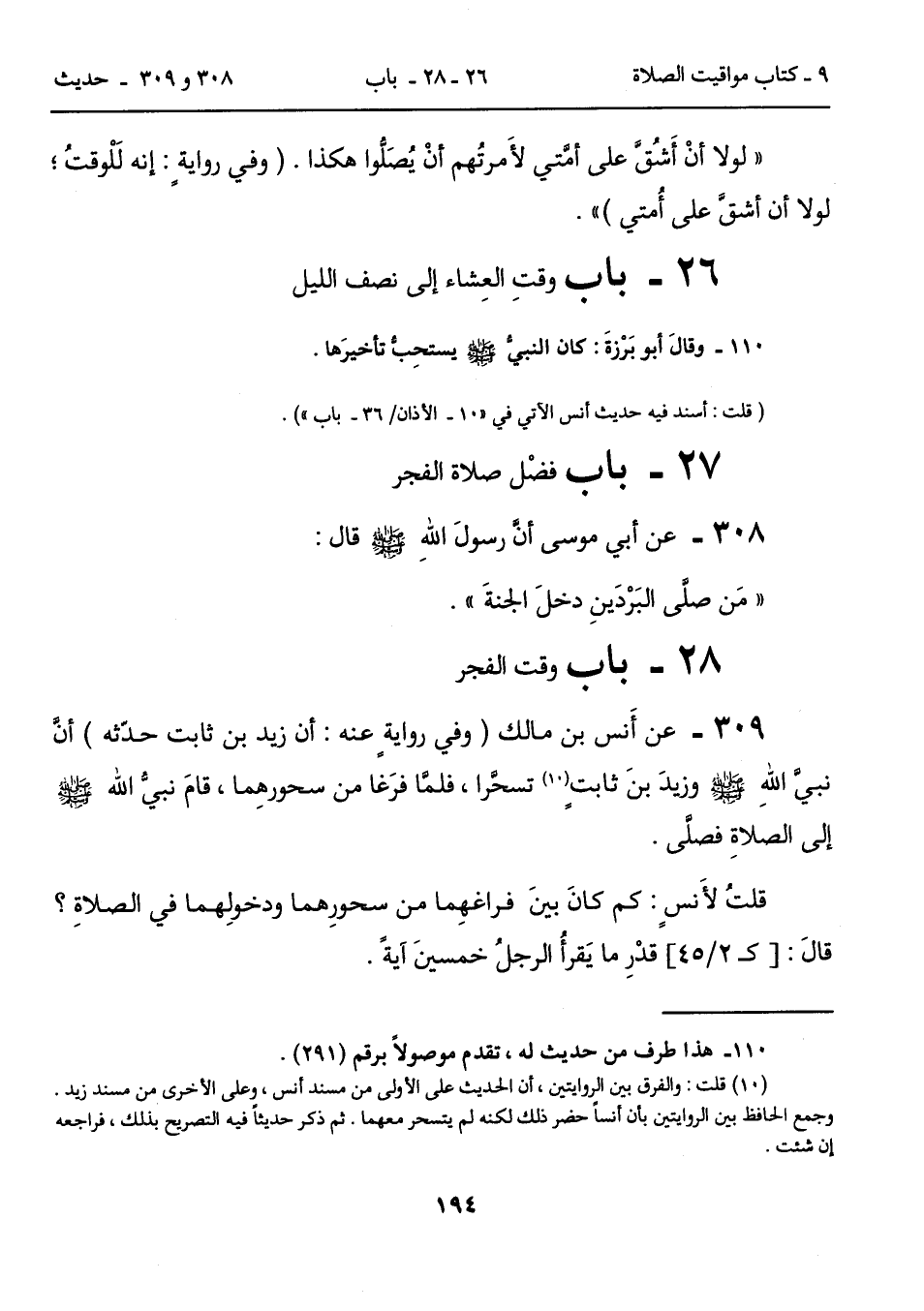 309 - عن أَنس بن مالك (وفي روايةٍ عنه: أن زيد بن ثابت حدّثه) أنَّ نبيَّ اللهِ - صلى الله عليه وسلم - وزيدَ بنَ ثابتٍ (10) تسحَّرا، فلمَّا فرَغا من سحورهِما، قامَ نبيُّ الله - صلى الله عليه وسلم - إلى الصلاةِ فصلَّى.