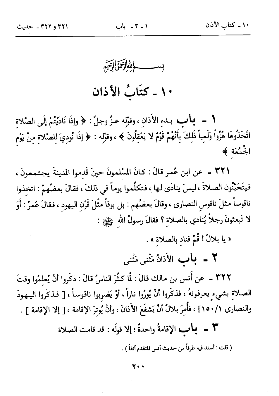 322 - عن أَنس بن مالك قالَ: لمَّا كثُرَ الناسُ قالَ: ذكَروا أنْ يُعلِمُوا وقتَ الصلاةِ بشيءٍ يعرفونهُ، فذكَروا أنْ يُورُوا ناراً، أوْ يَضرِبوا ناقوساً، [فذكَروا اليهودَ والنصارى 1/ 150]؛ فأُمِرَ بلالٌ أنْ يَشفَعَ الأَذانَ، وأنْ يُوتِرَ الإقامة، [إلا الإقامة].